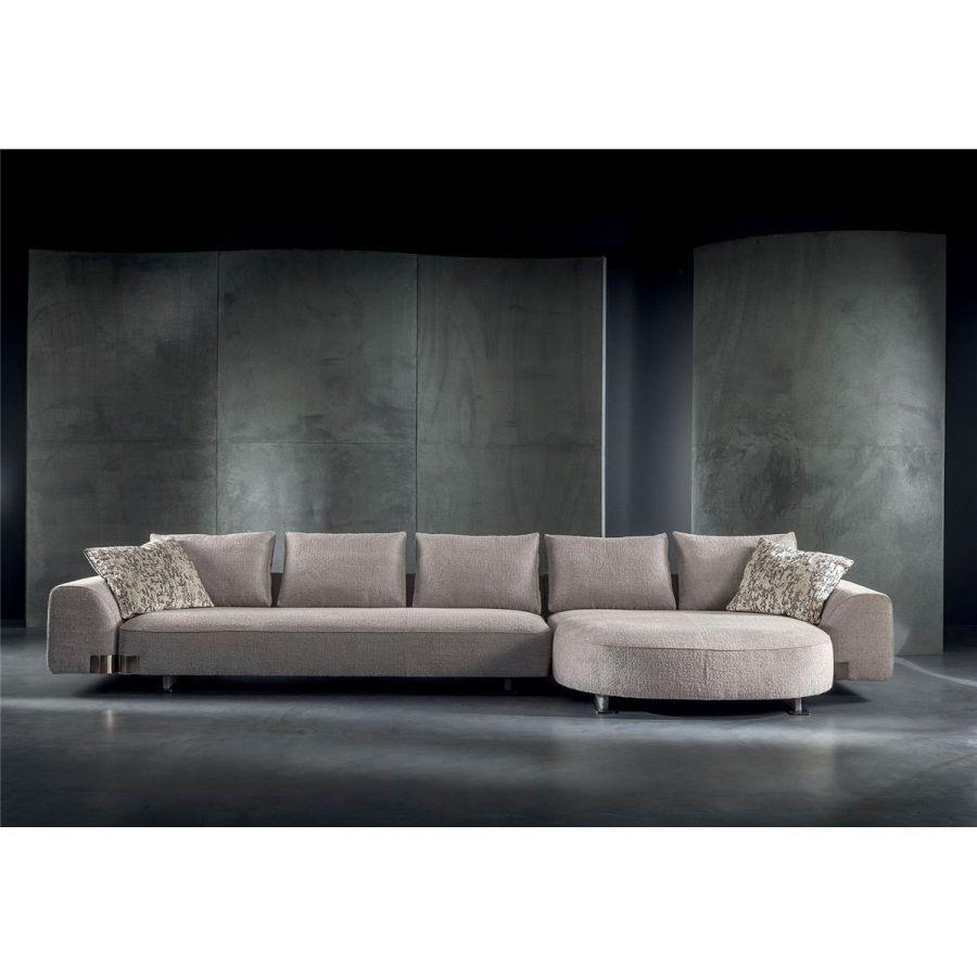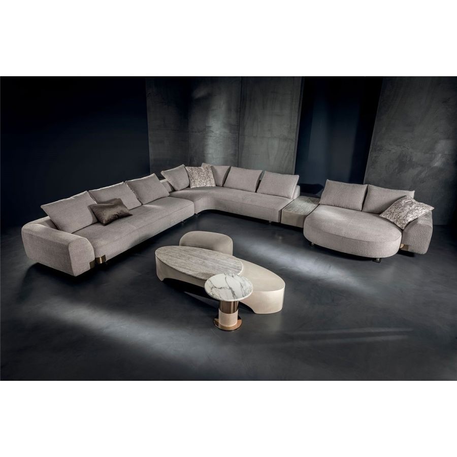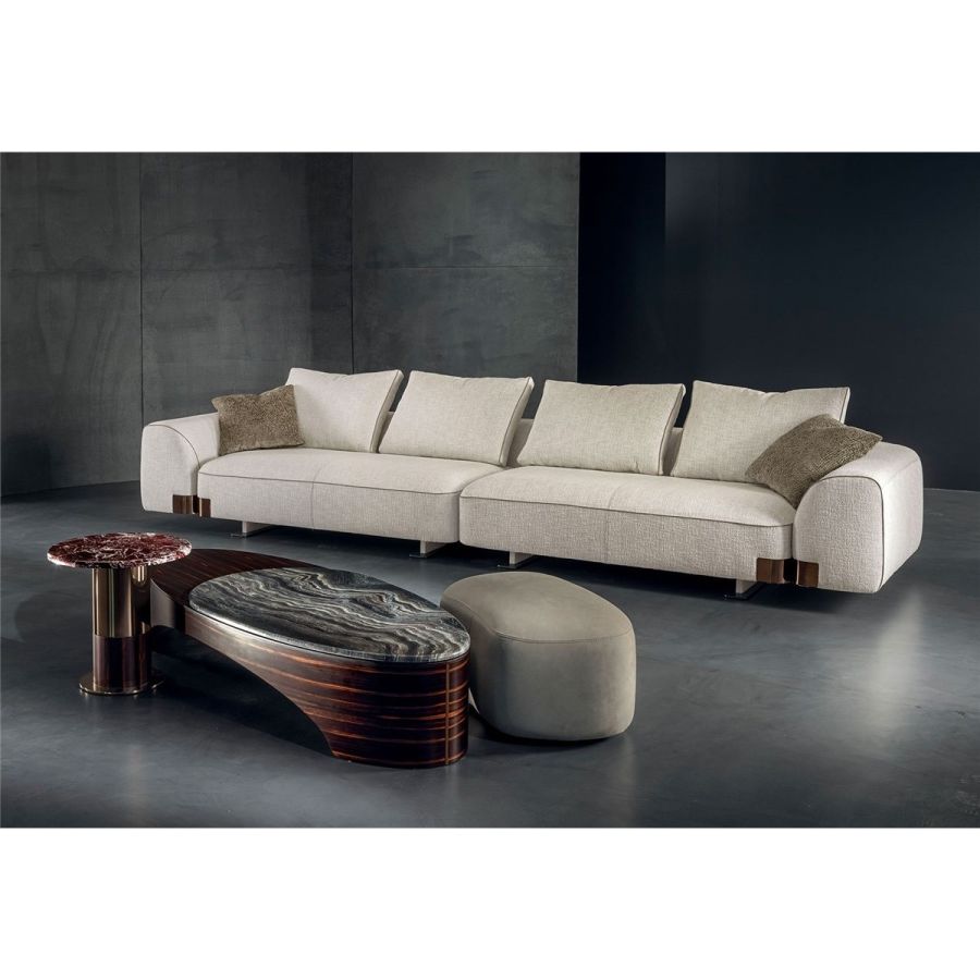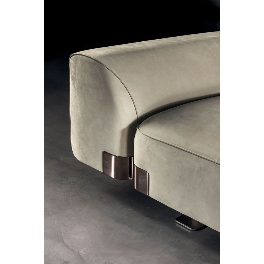 Collection of sofas and modular elements in various sizes. The structure is in wood with durable flexiblePVC slats supporting the seat made of multi-density polyurethane foam with Memory Foam. The backrest cushions are in sterilized goose down. The feet are in wood covered in leather and/or fabric in the same colour, with a metal base painted bronze. On the sides of the seat, there is an elegant semi-circular metal plate offered in the finishes in the catalogue: Satined Champagne, Bright/satined Burnished, Shaded copper, Bright/satined brown, Bright/satined Black rose, Bright/satined light gold, Bright/satined chrome,Bright/satined black chrome, Matt satined bronze. The upholstery CANNOT be removed from the structure and the seat, but the seat and backrest cushions covers in leather or fabric are removable.