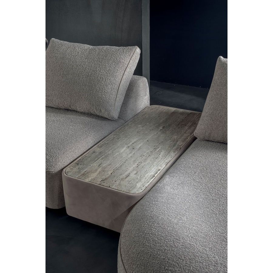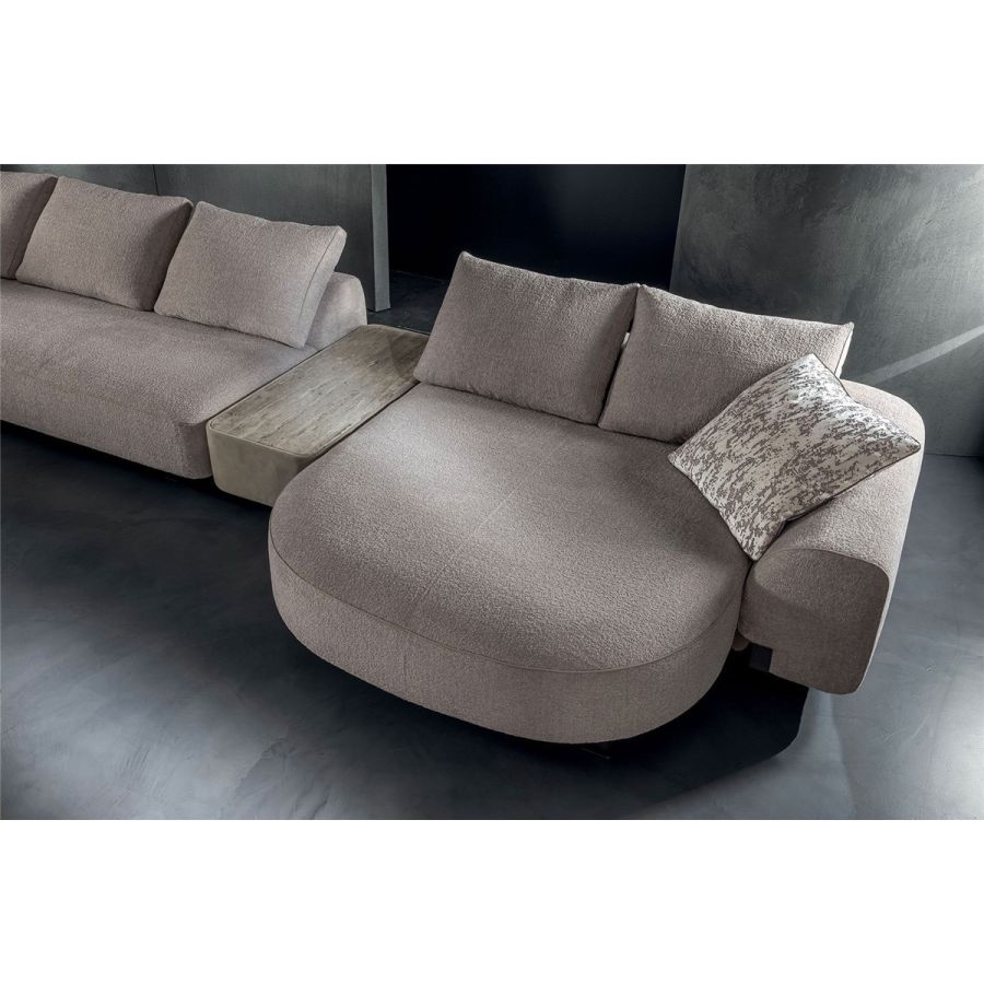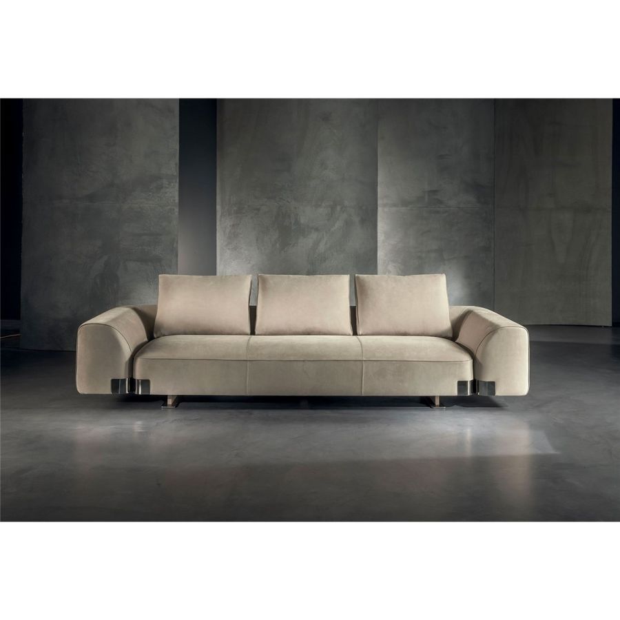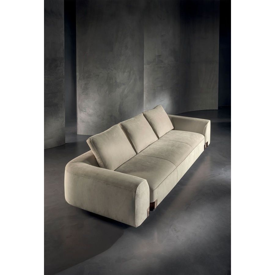 Collection of sofas and modular elements in various sizes. The structure is in wood with durable flexiblePVC slats supporting the seat made of multi-density polyurethane foam with Memory Foam. The backrest cushions are in sterilized goose down. The feet are in wood covered in leather and/or fabric in the same colour, with a metal base painted bronze. On the sides of the seat, there is an elegant semi-circular metal plate offered in the finishes in the catalogue: Satined Champagne, Bright/satined Burnished, Shaded copper, Bright/satined brown, Bright/satined Black rose, Bright/satined light gold, Bright/satined chrome,Bright/satined black chrome, Matt satined bronze. The upholstery CANNOT be removed from the structure and the seat, but the seat and backrest cushions covers in leather or fabric are removable.