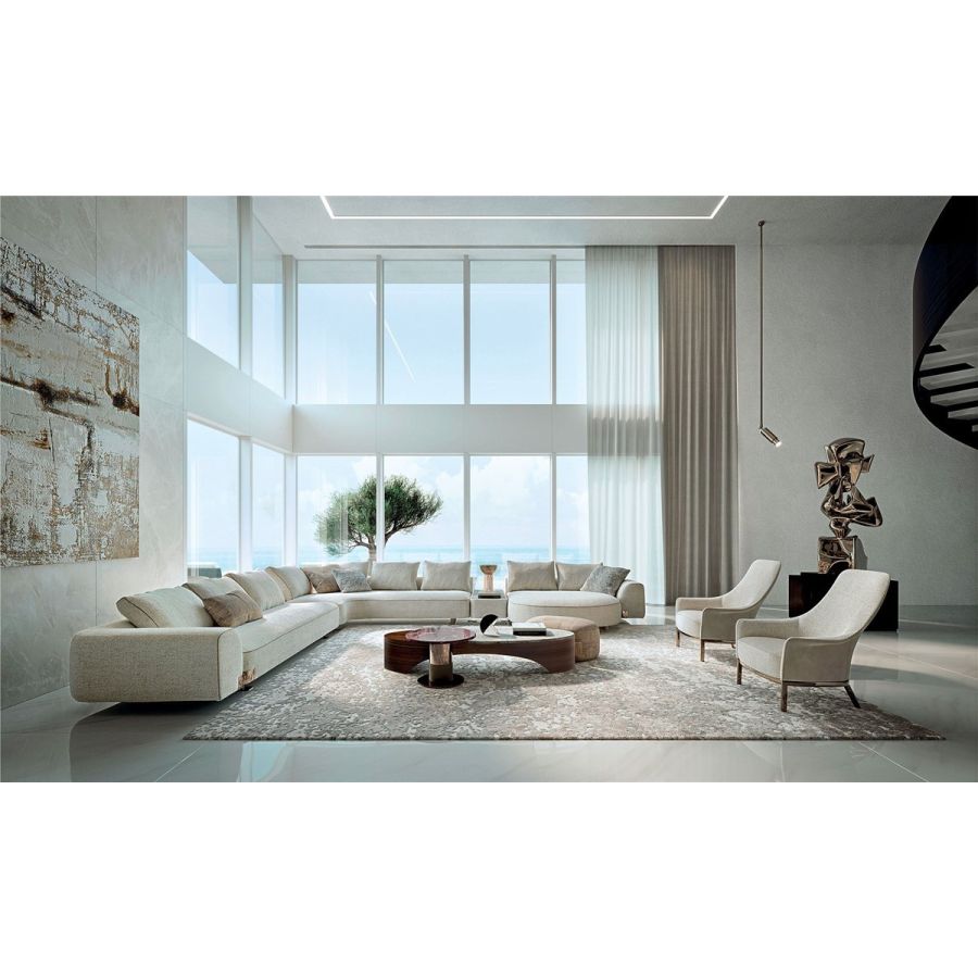 A spacious sofa, featuring a wide and welcoming seat that gently cradles the cushion, inviting you to sink in and relax. Its elegance is manifested in a curved metal element, delicately positioned around the volumes of the armrest and the seat. The metallic detail adds a touch of brightness to the entire product, drawing the eye and illuminating the space around it like a precious gem.