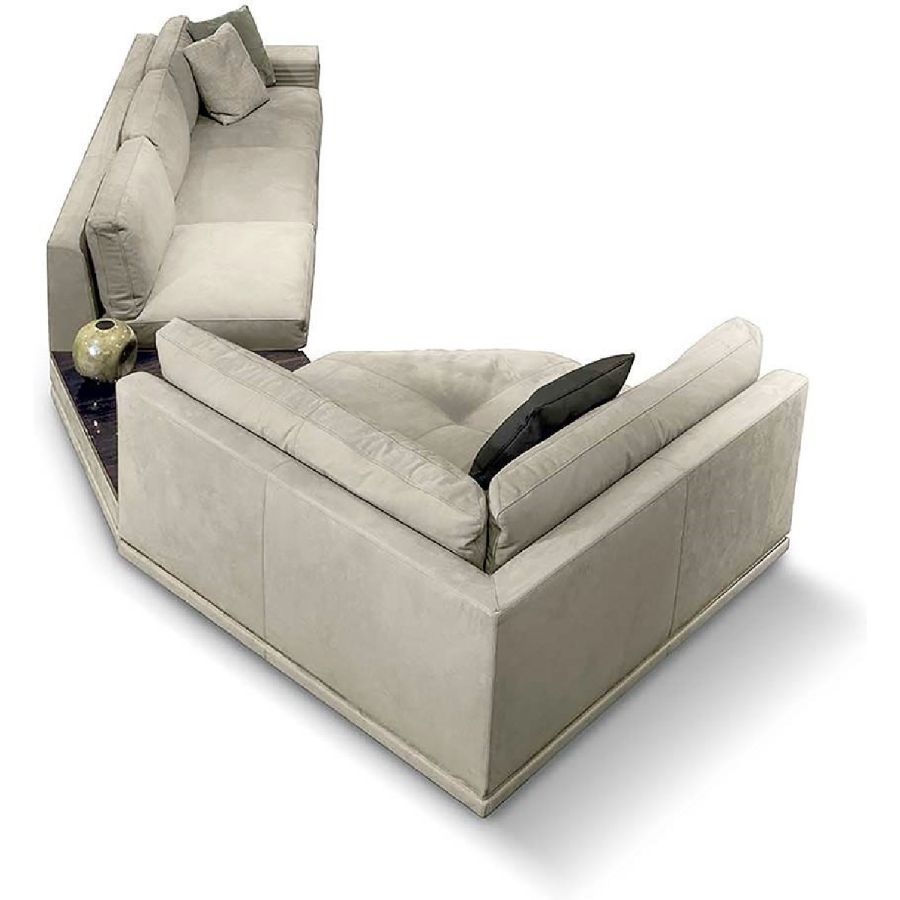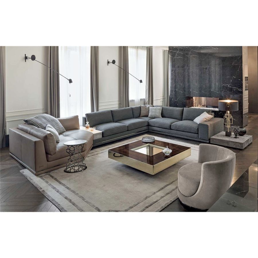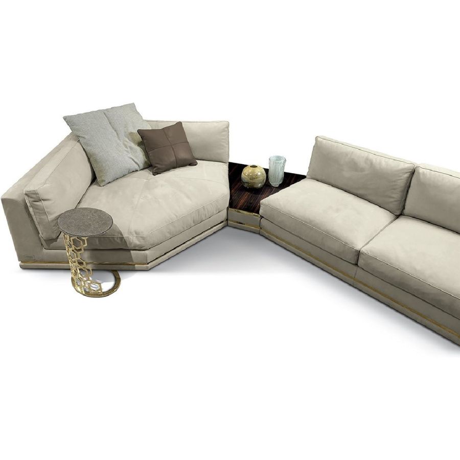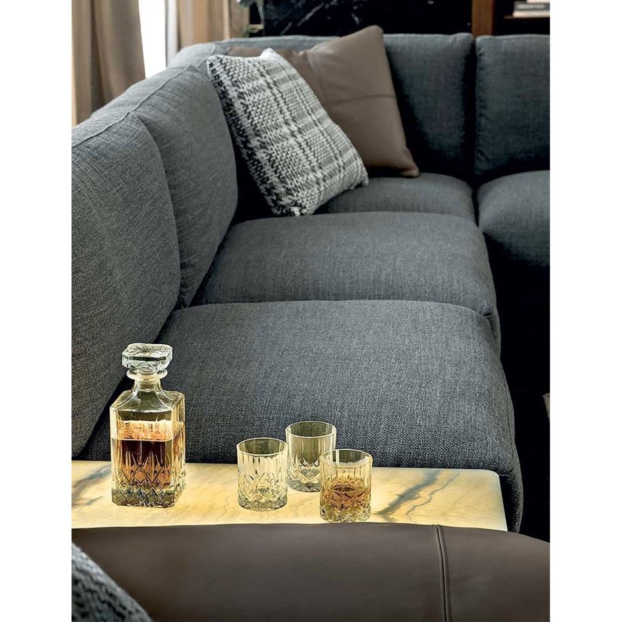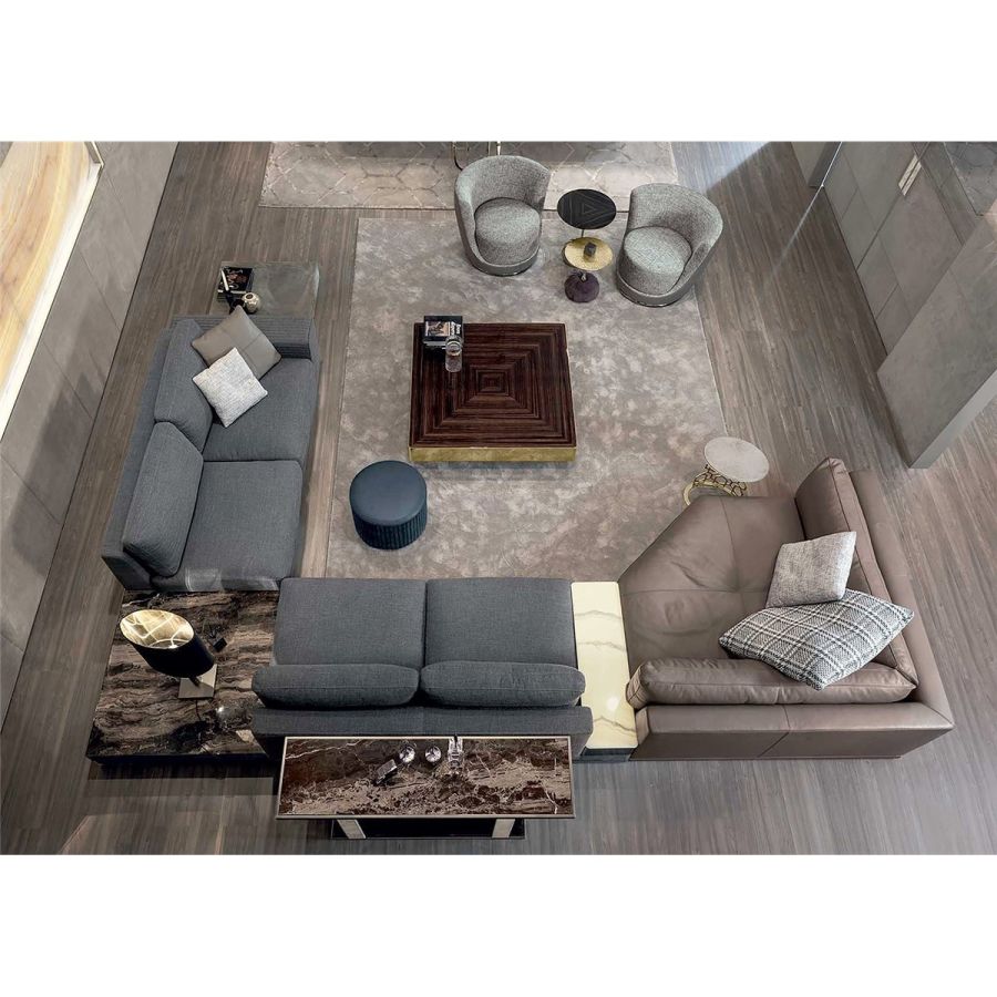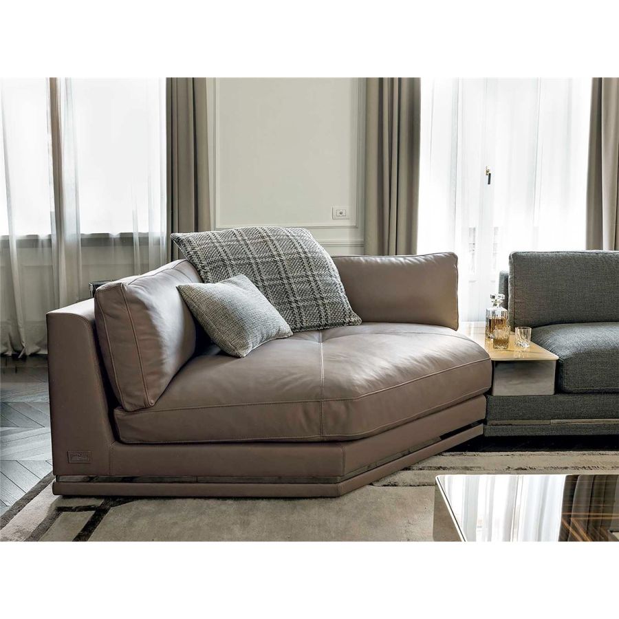 The collection has two types of armrest: high padded armrest with quilted stripe design, or low in metal in Longhi range finishes and utility shelf in backlit dimmable onyx or marble. Another feature is its modularity: versatile corner elements make it possible to offer a wide range of compositions. Open corners can be used in corner compositions or as individual chaise longue units. Different types of small tables for specific uses complete the collection: covered in leather or fabric, with tops in marble, wood or mirror in range colours, with the option of inserting a practical bar compartment or storage compartment with flap door on the rectangular unit. The sofa structure is in wood with high-resistance elastic bands, covered in high density polyurethane foam. Seat cushions are in sterilized goose down, with inserts in multi-density polyurethane foam, with rounded Memory Foam surface for better resistance to crushing over time. Backrest cushions are in MULTIFILL, a special mixture of soft sterilised goose down combined with Rollofill, a synthetic fibre, and polyurethane foam chips, which make the cushion soft and comfortable, preventing the crushed effect typical of down filled cushions. The metal perimeter border at the base of the sofa is available in the following finishes: Satin nickel, bright shaded brown, bright light gold, matt Champagne gold, bright chrome, bright black chrome, matt satin bronze, bright pink gold, matt pink gold, Black Rose gold. Given the special manufacturing process, the sofa structure upholstery is not removable, but the seat cushion upholstery in leather or fabric can be removed.