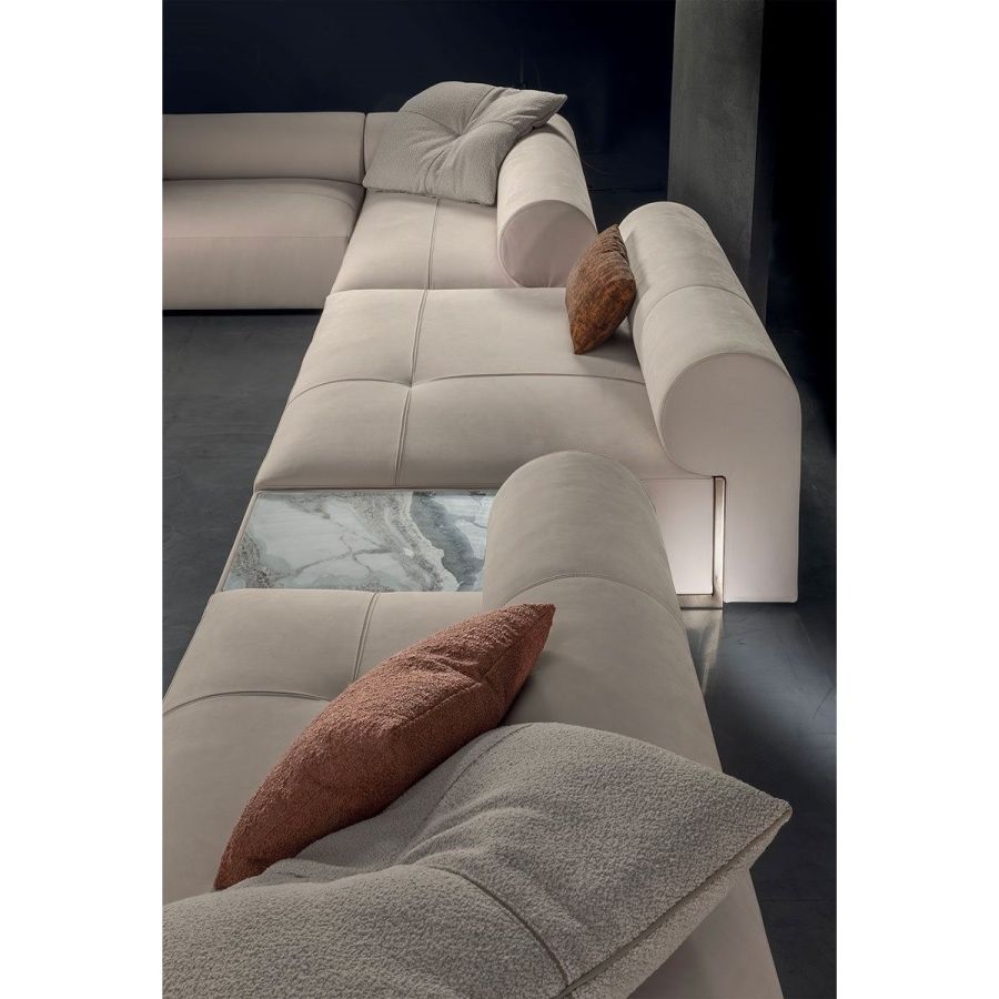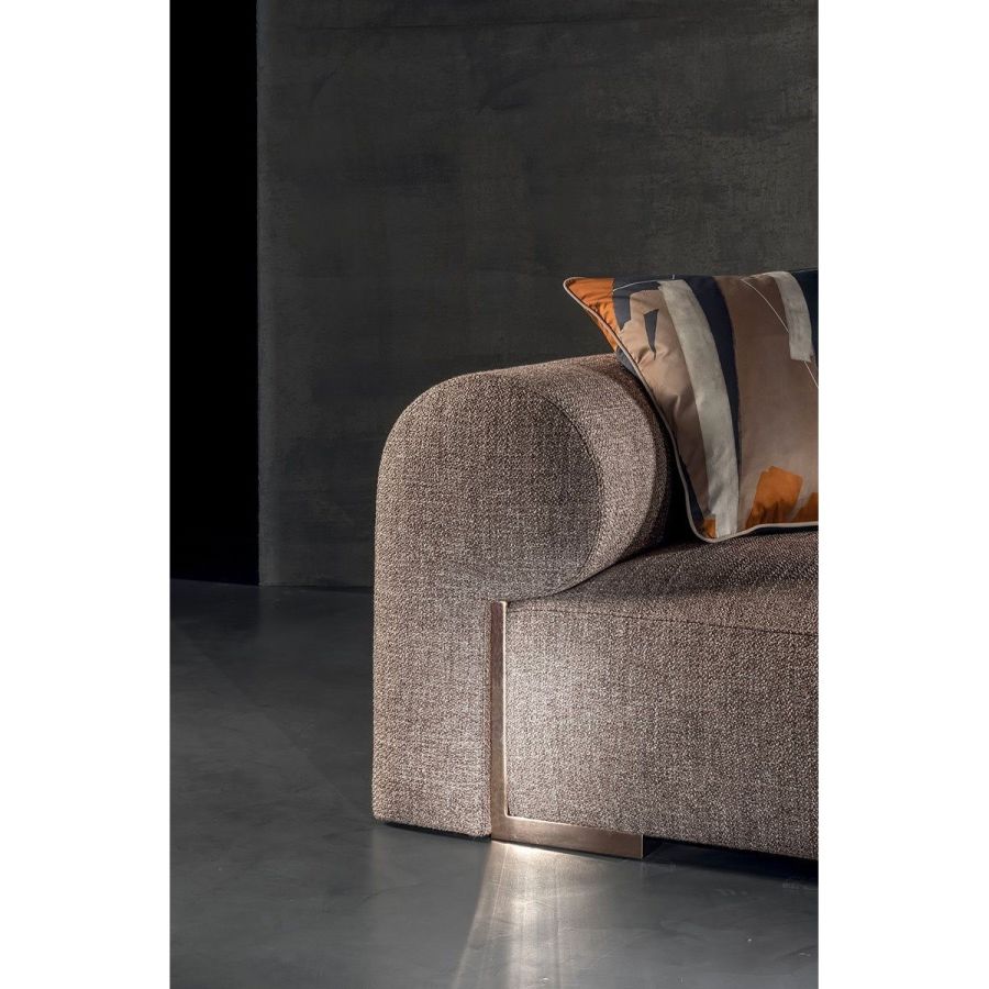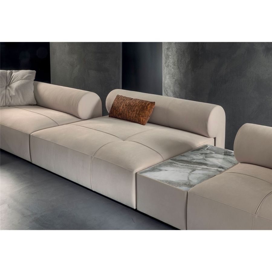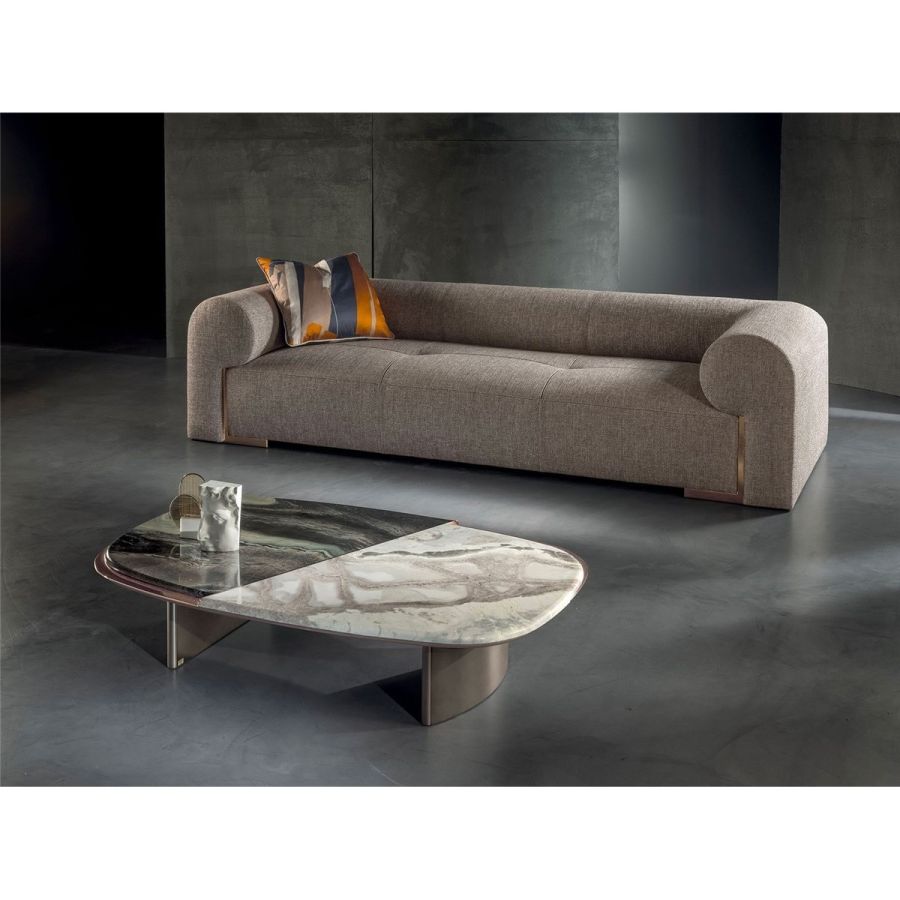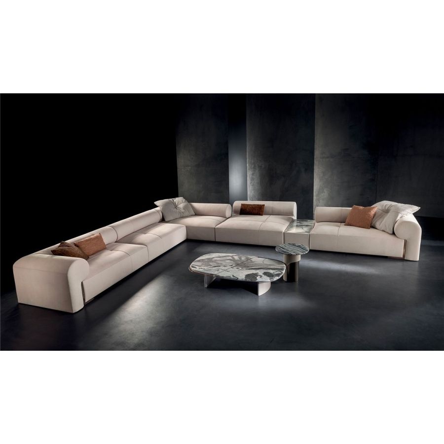 Sofas and modular elements in various sizes, all with a high level of comfort obtained from mixing special polyurethane foams with various densities and Memory Foam. Supported by wooden structures, and seats are supported by durable flexible PVC slats. The seat upholstery has a particular sartorial stitching, with a plain coloured or contrasting leather and/or fabric insert for a striking chromatic effect. Given the particular manufacturing process, the leather or fabric upholstery is NOT removable. Metal feet in the following finishes are positioned at the front: satined Champagne, Bright/satined Burnished, Shaded copper, Bright/satined brown, Bright/satined Black Rose, Bright/satined light gold, Bright/satined chrome, Bright/satined black chrome, Matt satined bronze. The collection is completed with small tables covered in leather and/or fabric, with marble inserts in the tops, from the catalogue.