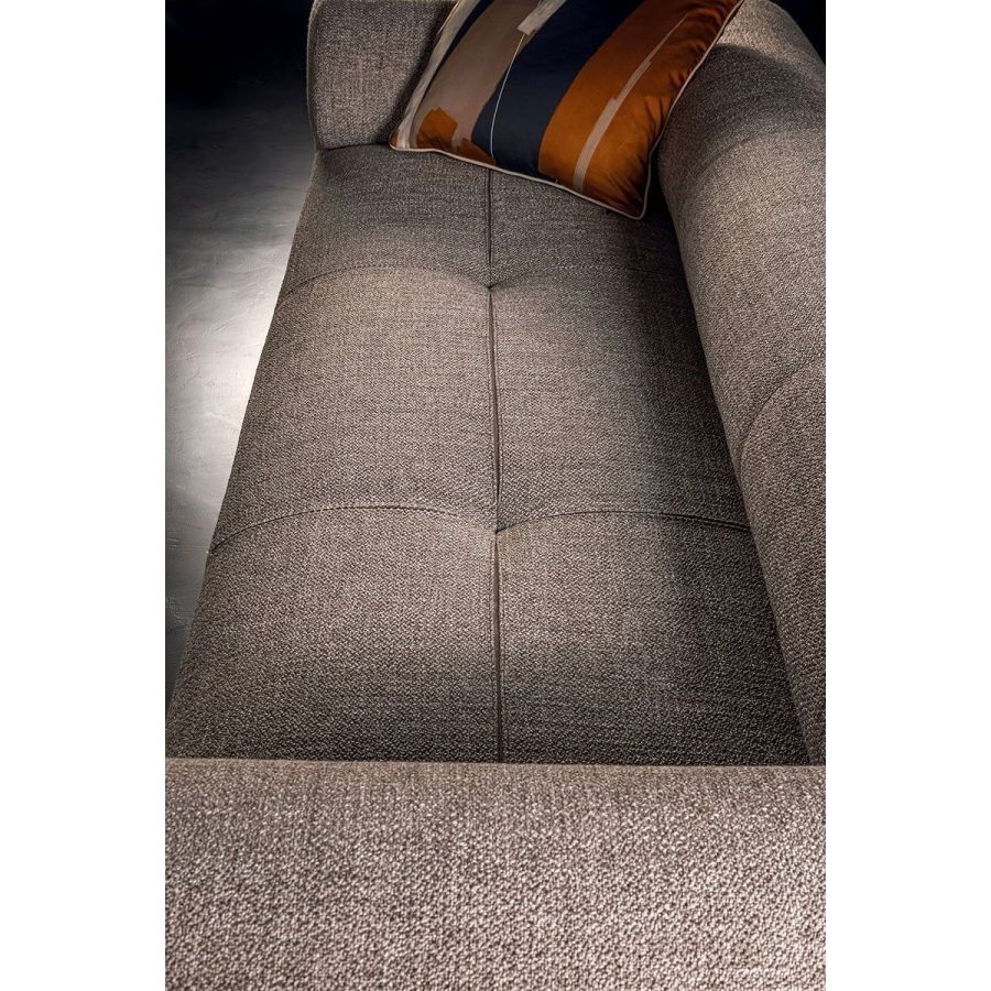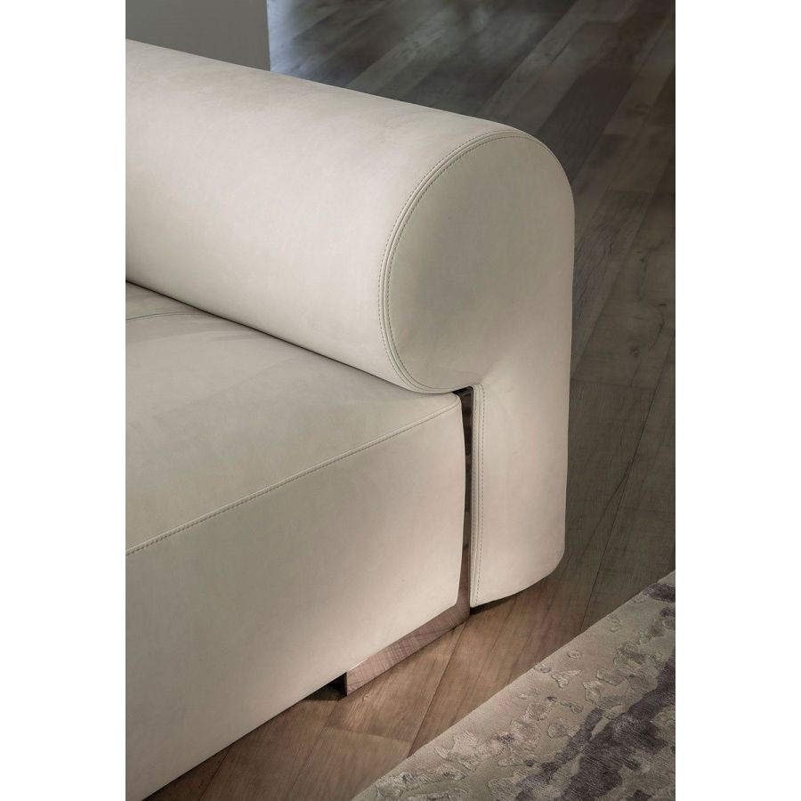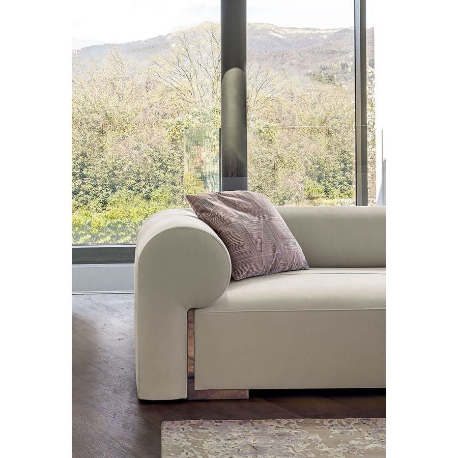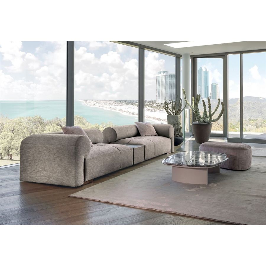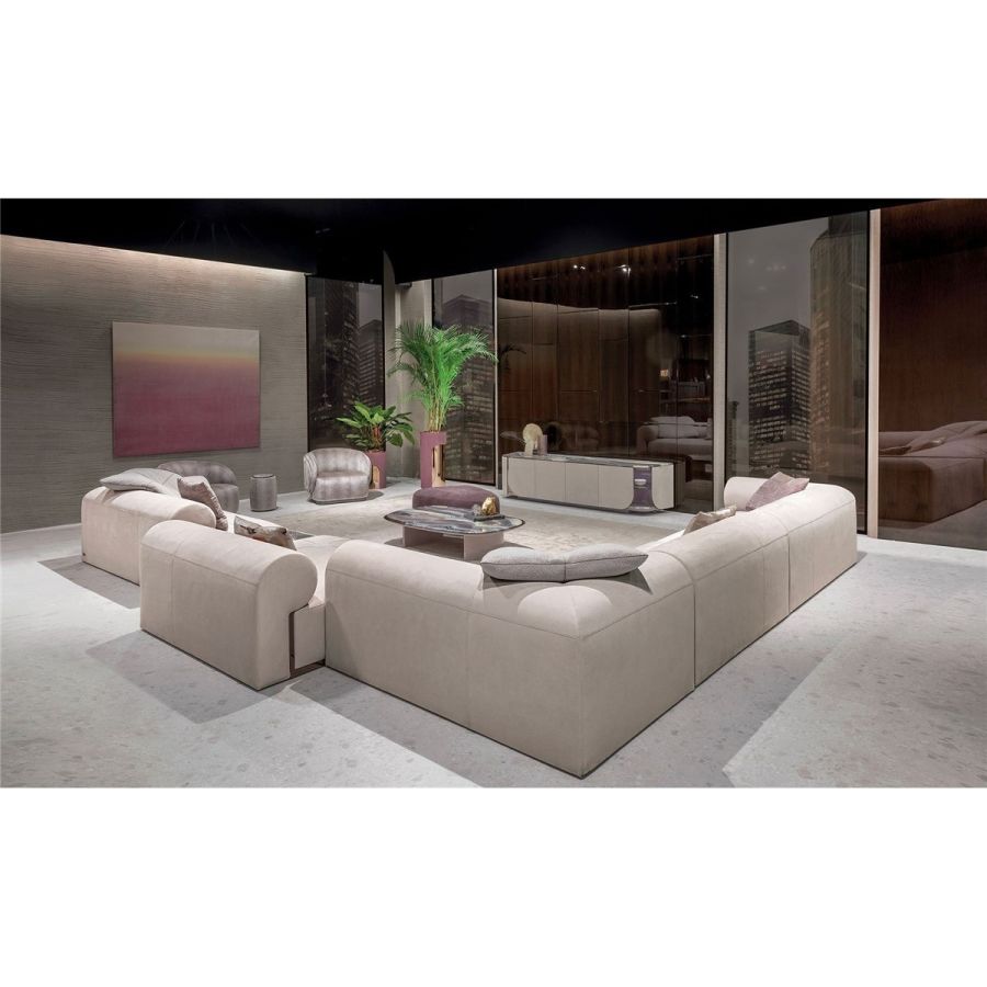 Sofas and modular elements in various sizes, all with a high level of comfort obtained from mixing special polyurethane foams with various densities and Memory Foam. Supported by wooden structures, and seats are supported by durable flexible PVC slats. The seat upholstery has a particular sartorial stitching, with a plain coloured or contrasting leather and/or fabric insert for a striking chromatic effect. Given the particular manufacturing process, the leather or fabric upholstery is NOT removable. Metal feet in the following finishes are positioned at the front: satined Champagne, Bright/satined Burnished, Shaded copper, Bright/satined brown, Bright/satined Black Rose, Bright/satined light gold, Bright/satined chrome, Bright/satined black chrome, Matt satined bronze. The collection is completed with small tables covered in leather and/or fabric, with marble inserts in the tops, from the catalogue.