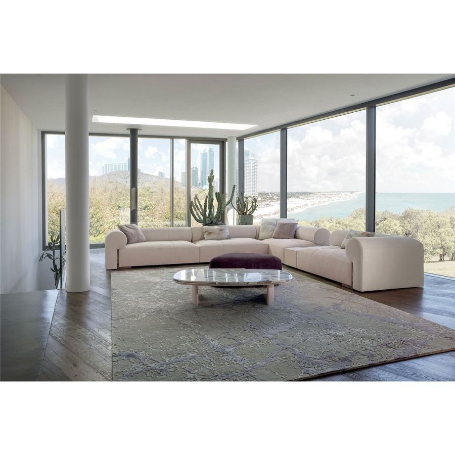 The Hug sofa brings together classic shapes and contemporary compositions, with alternating circular, semi-circular, and rectangular forms that create a dynamic effect. A low, nearly monolithic piece of furniture, the Hug sofa stands out for it sample armrests, which embrace the seat, and its stitching, which outlines the shapes of the various components, adding visual interest.