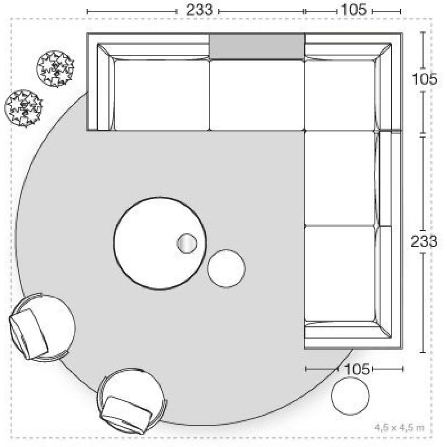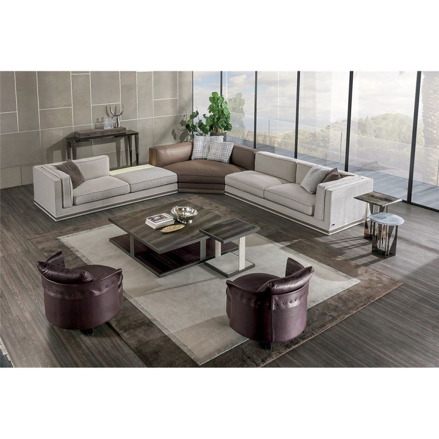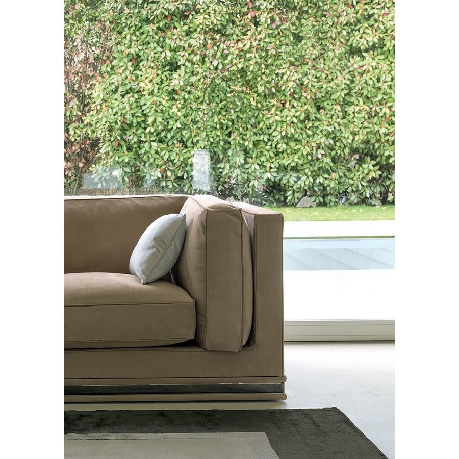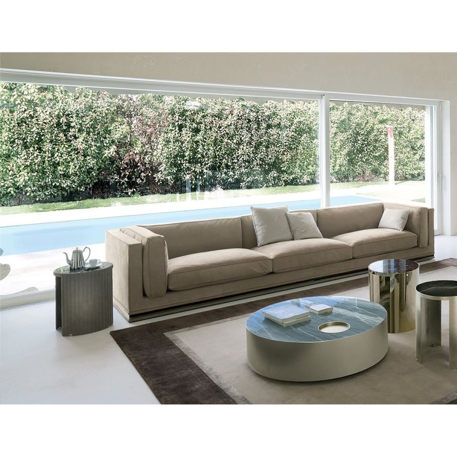 Frame in wood with elastic bands, covered in high density polyurethane foam. Backrest and armrest cushions are in sterilised goose down, with insert in medium-density polyurethane foam, and seat cushions are in triple-density polyurethane foam covered in sterilised goose down and supported with Memory Foam padding in order to maintain shape more effectively. Sofa available in two versions: fully padded without base or with chromed metal ring in the following finishes: Satin nickel, bright shaded brown, Black Rose gold, bright light gold, matt Champagne gold, bright chrome, bright black chrome, matt satin bronze, bright pink gold, matt pink gold. The open corner element, which can be used in compositions or as a chaise longue end unit - end unit with padded utility shelf, or utility shelf in marble or backlit dimmable onyx. Given the special manufacturing process, the structure upholstery is not removable, but the leather or fabric covers of all cushions are removable. The sofa comes in two depths: 105 and 95 cm.