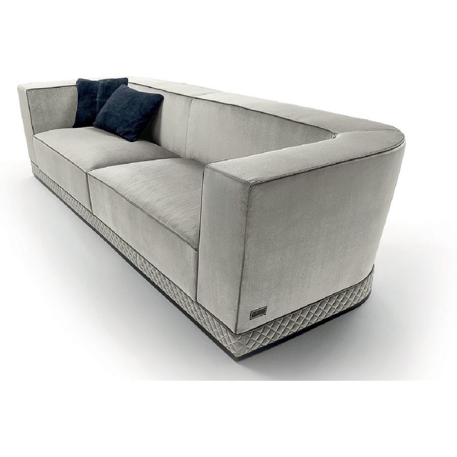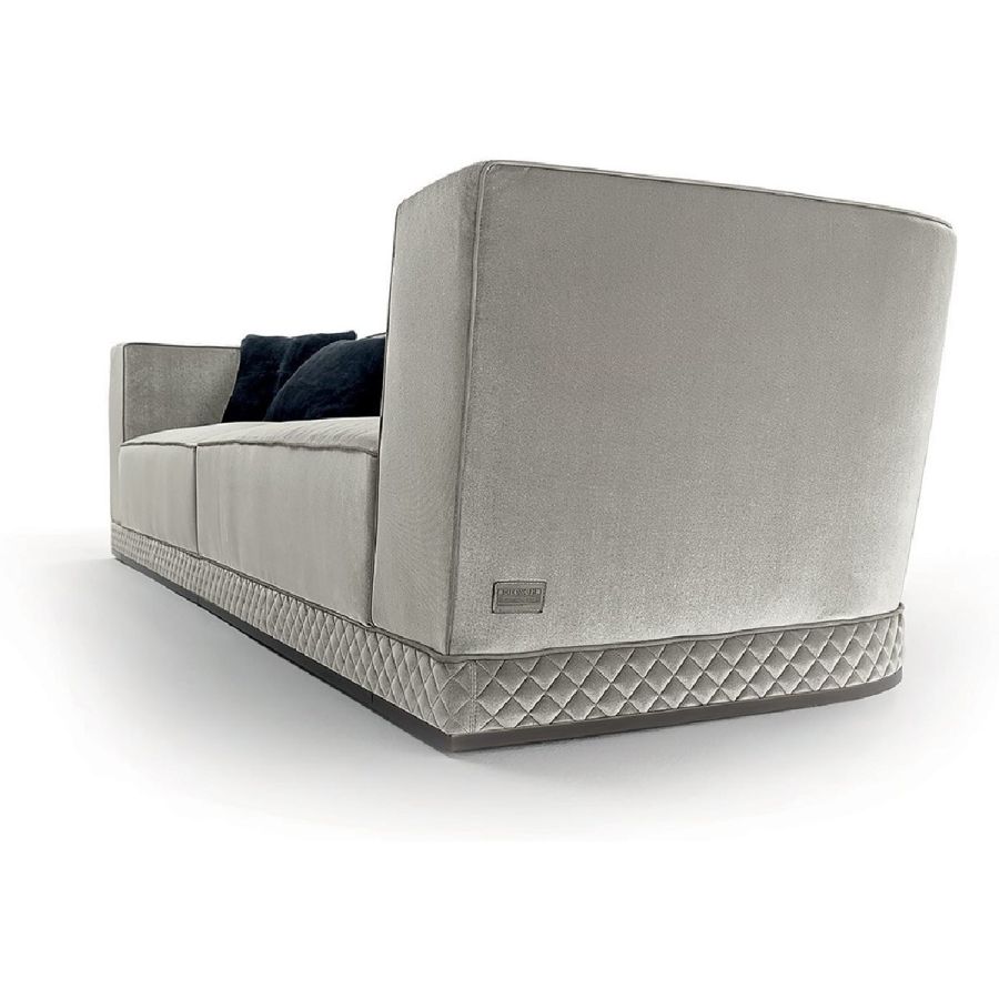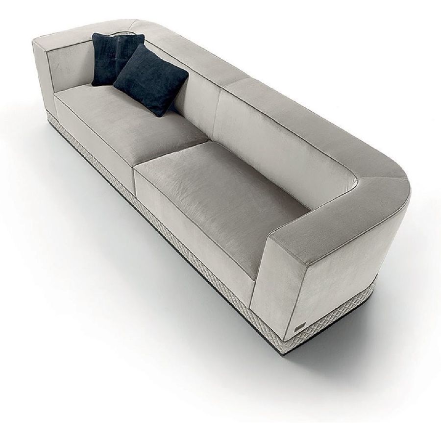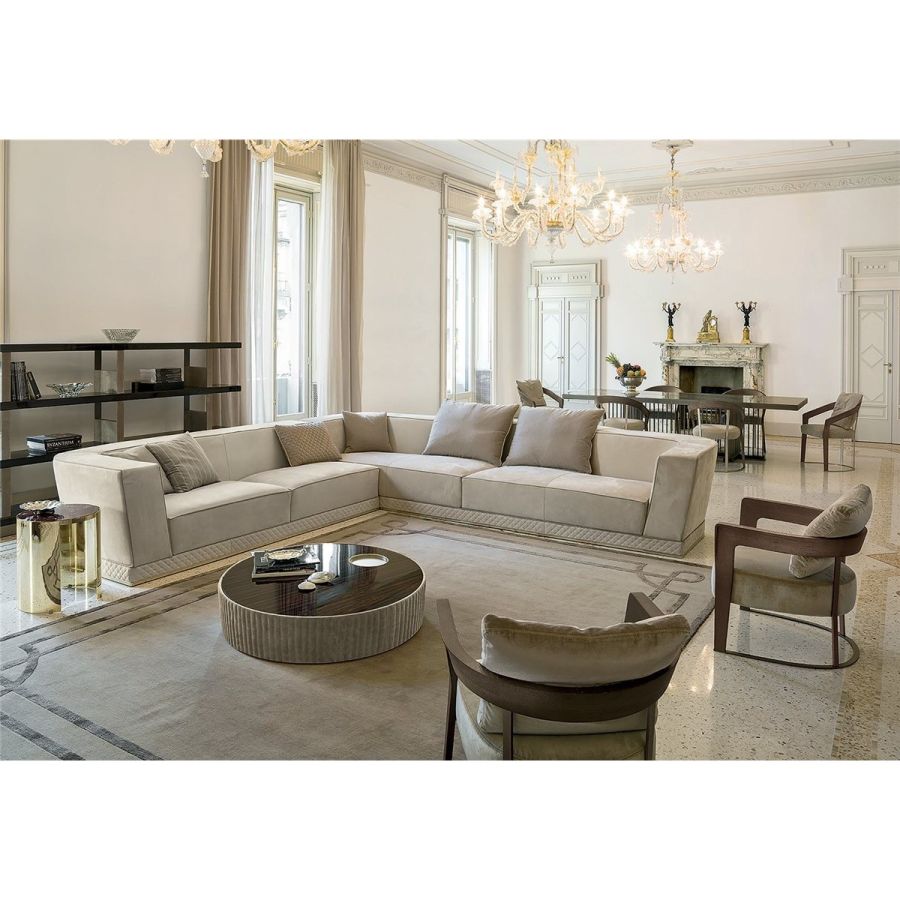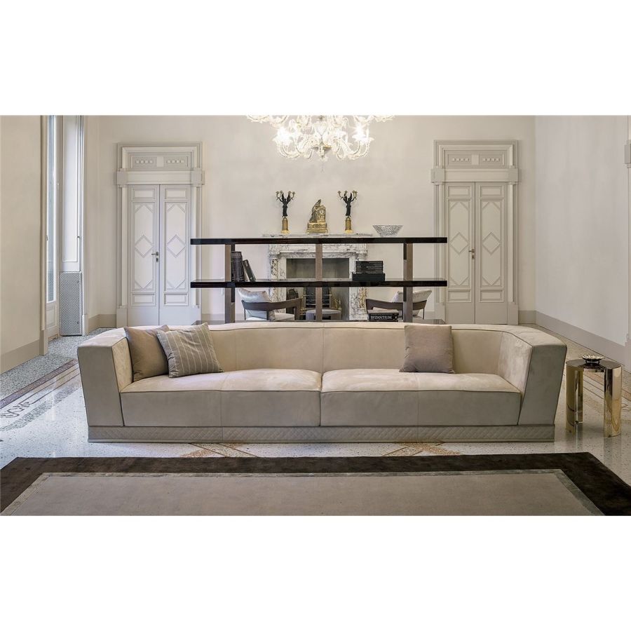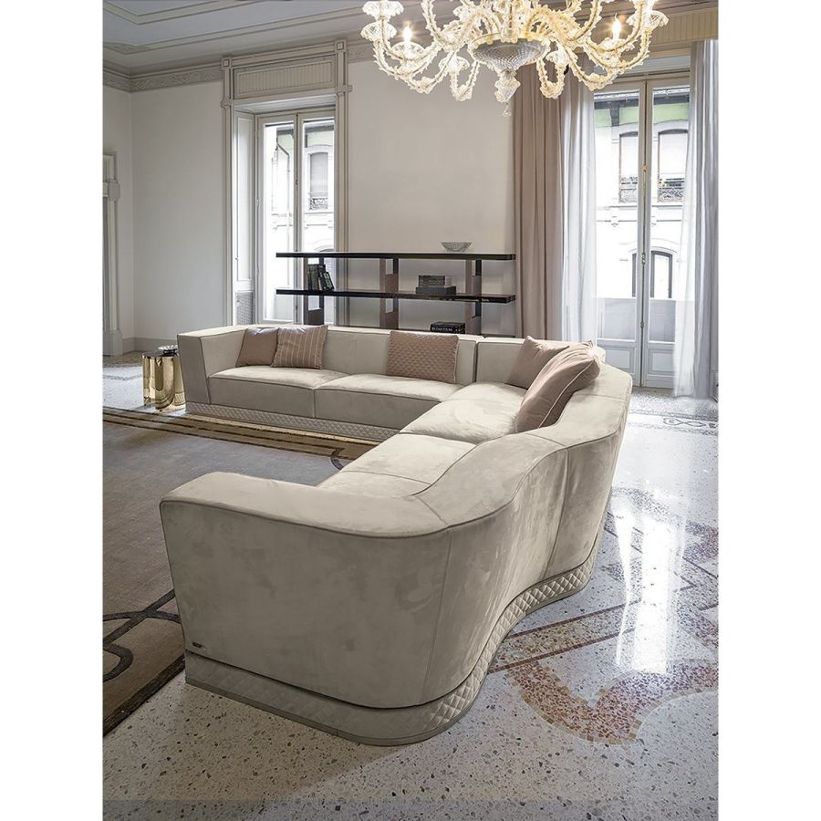 Two version of this sofa: with standard depth of cm 100 and in the larger double depth cm 100\120. Various elements can be combined to form corner compositions. Wood structure covered in polyurethane foam in different thicknesses. The seats have la beech wood structures with elastic bands covered in triple thickness polyurethane foam covered in sterilised goose down, supported by Memory Foam padding that allows it to keep its shape. The structural base is in wood and can be covered with a smooth or diamond-shaped quilted cover, finished with a chromed metal ring in the finishes: Satin nickel, bright shaded brown, bright light gold, matt Champagne gold, bright chrome, bright black chrome, matt satin bronze, bright pink gold, matt pink gold, Black Rose gold. Backrest cushions in sterilised goose down, provided only in the double depth version. Given the special manufacturing process, the upholstery of this model is not removable.