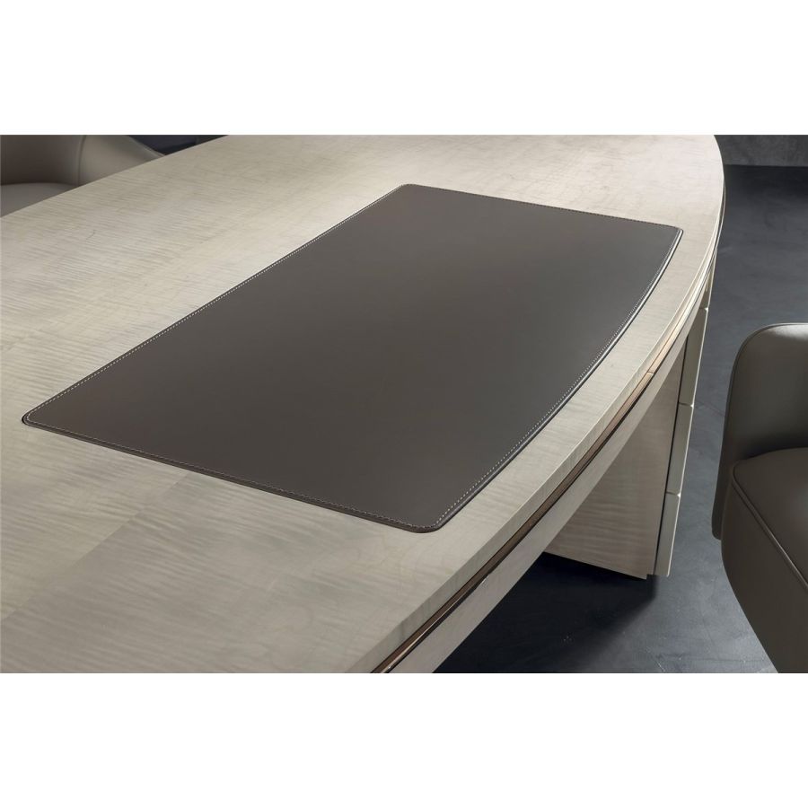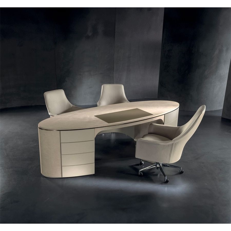 Elliptical desk with a wooden bridge structure in the finishes: Matt eucalyptus, Matt ebony, Matt sycamore frisè. Or covered in coloured leather from the catalogue. The desk has two chests of drawers incorporated into the structure. Each has 4 drawers with fronts in wood or leather. The elliptical top is in wood with the same finish as the structures with leather inserts. Under the top, there is a decorative metal profile in the following finishes: Satined champagne, Bright/satined Burnished, Shaded copper, Bright/satined shaded brown, Bright/satined Black rose, Bright/satined light gold, Bright/satined chrome, Bright/satined black chrome, Matt satined bronze. A cable hole is available on request