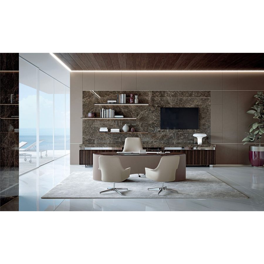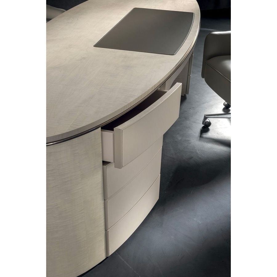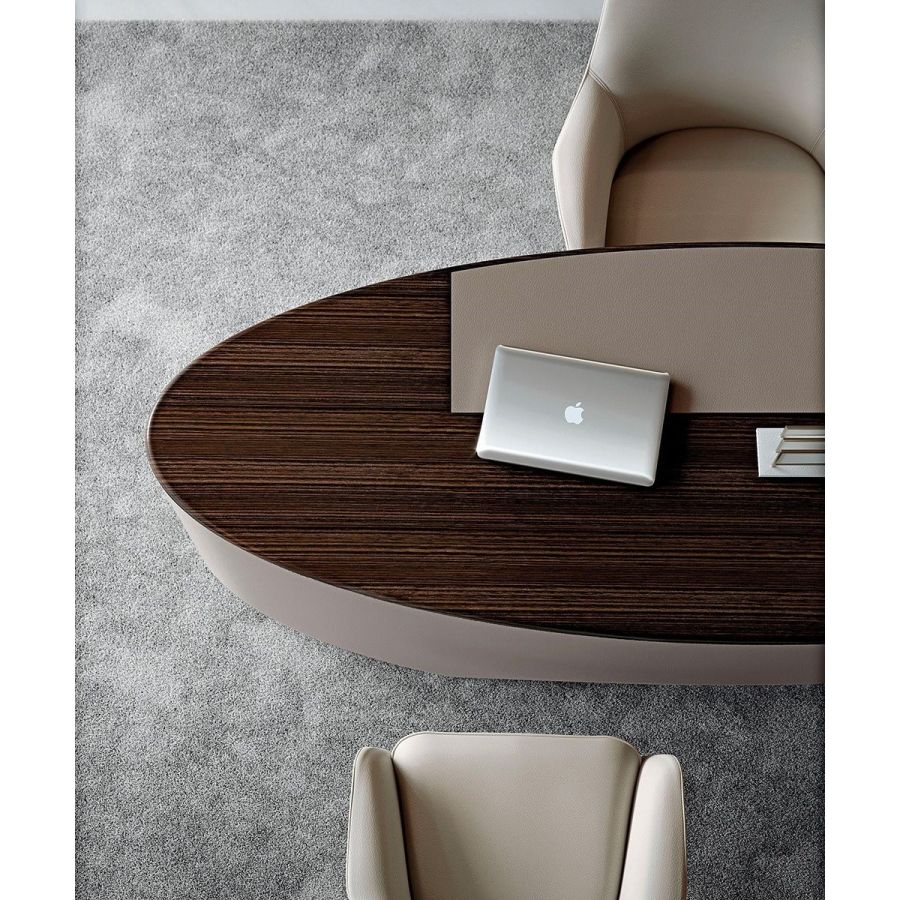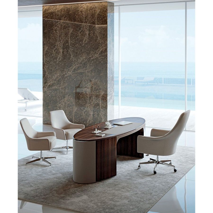 This elliptical desk stands out for its refined combination of aesthetic and functionality. The bridge structure is available in wood and covered in leather. It has two drawer units with four drawers each. The elliptical top is in wood with a leather insert, which adds a touch of class and personality to the desk. A thin metal profile under the top makes the desk look even more exclusive, as it highlights the attention to detail and the quality of the craftsmanship.