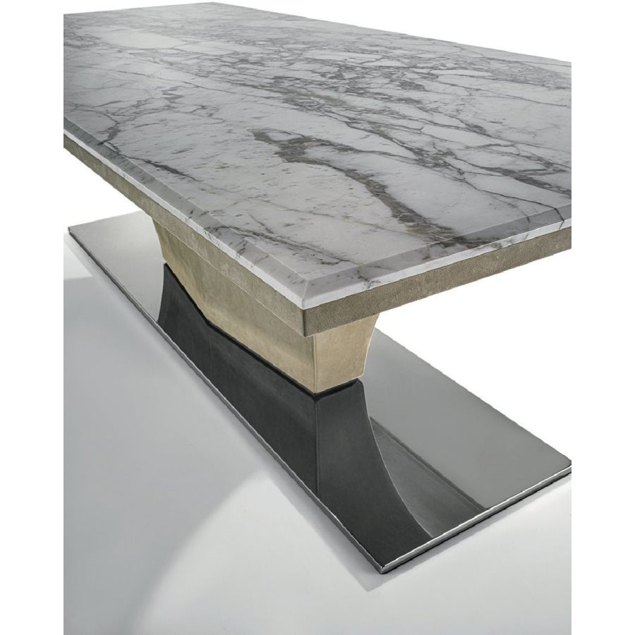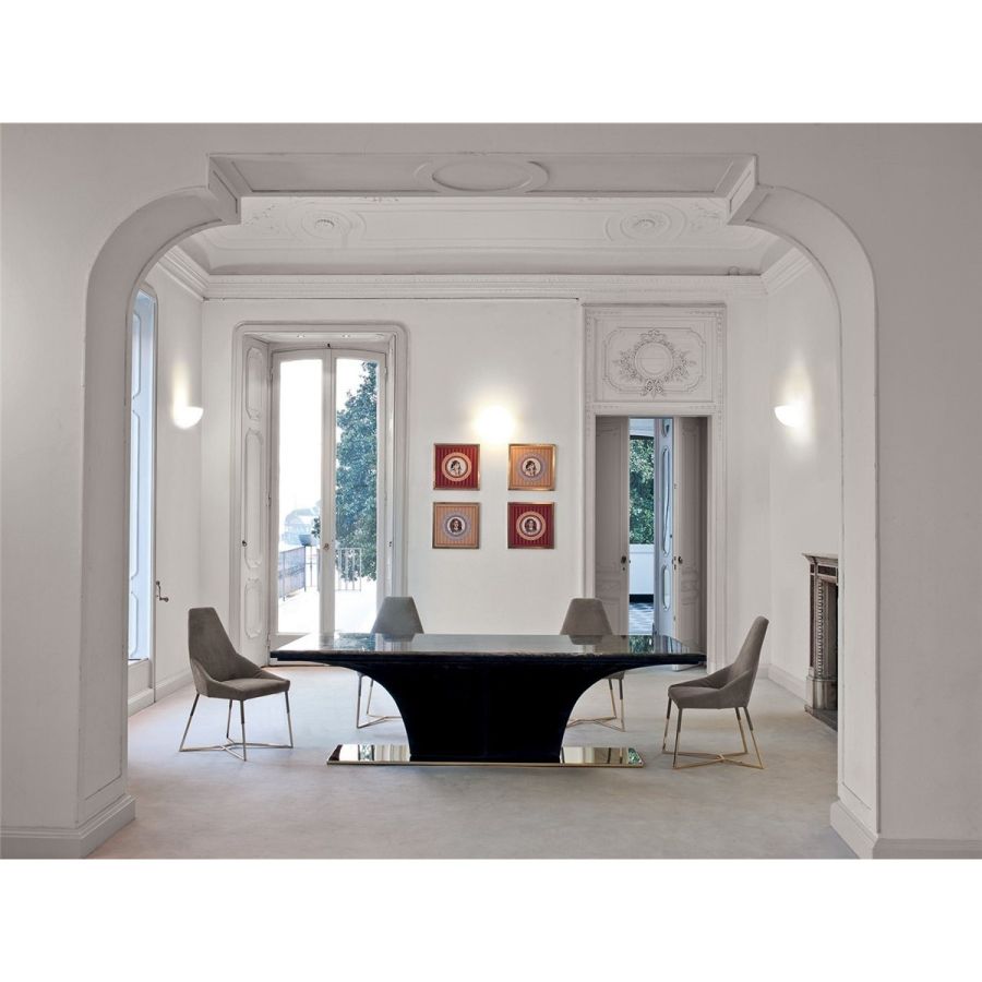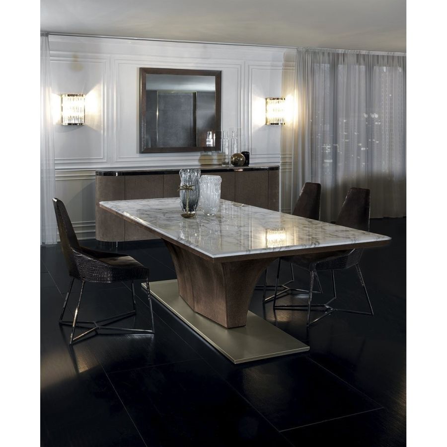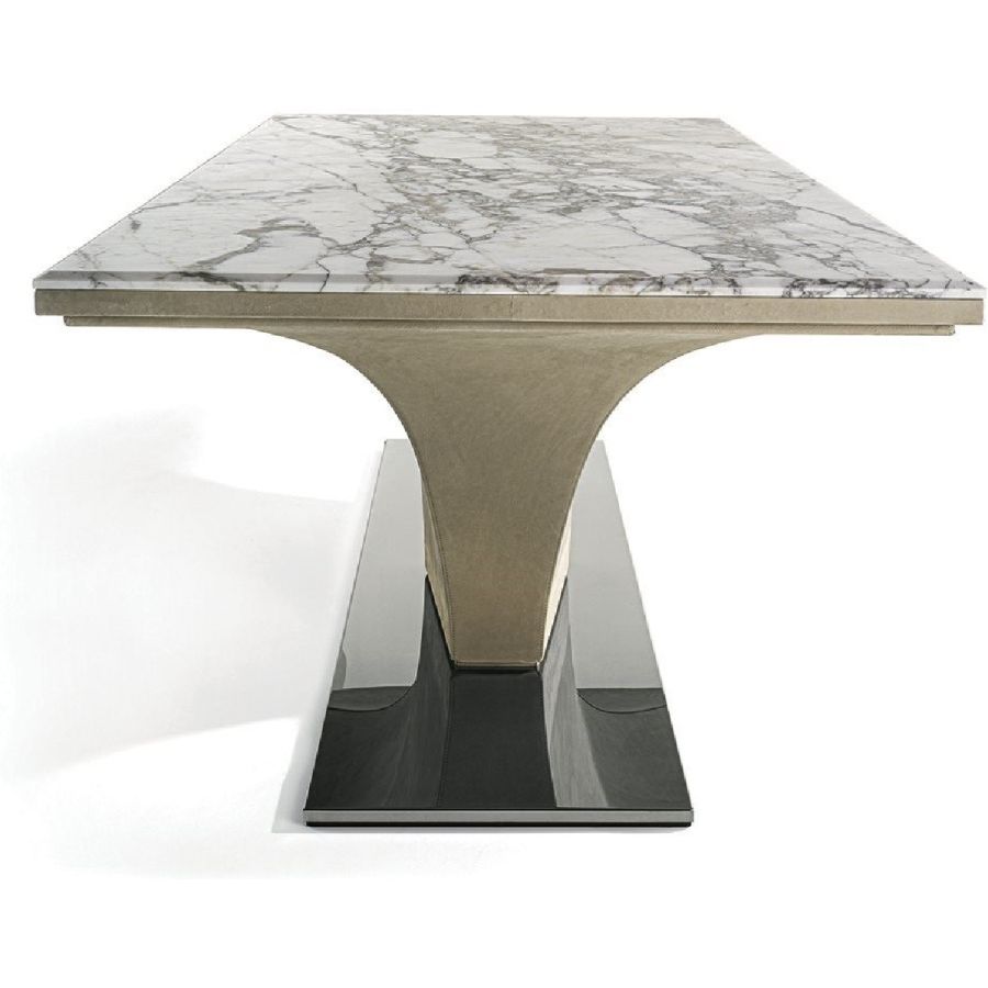 The Omotesando table has an important tapered shell covered in leather, and a thin rectangular metal base that sets on the floor. The table has a strong personality, and can fit into any room with style and elegance, and blend harmoniously with all of the chairs form the Longhi collection.