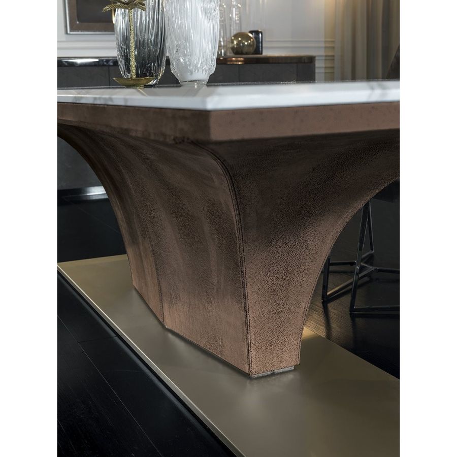 Load-bearing metal frame with wood exterior, covered in leather in the catalogue colors. Metal base with finishes of: Satin nickel, Bright shaded brown, Black Rose gold, bright light gold, matt Champagne gold, bright chrome, bright black chrome, matt satin bronze, bright pink gold, matt pink gold. Top finishes: painted black crystal 10 mm with bevelling, bronze or smoky mirror 6 mm with bevelling, 20 mm thick marble, with 20 mm bevel in: White Carrara marble, Imperial Brown marble, Sahara Noir marble (glossyand matt polyester finish), Dover White marble, Panda White marble, Guatemala Green marble, Corteccia marble, Port Saint Laurent marble, Red Levanto marble, Bardiglio Nuvolato marble, Elegant Brown marble,Shale Rosewood marble, Emperador Dark marble, Silver Wave marble, Agatha Black marble, Frappuccino marble, Calacatta marble, Fusion Light marble, Patagonia marble, Explosion Blue marble, Fusion Multicolor marble, Juliet Quartz marble.
