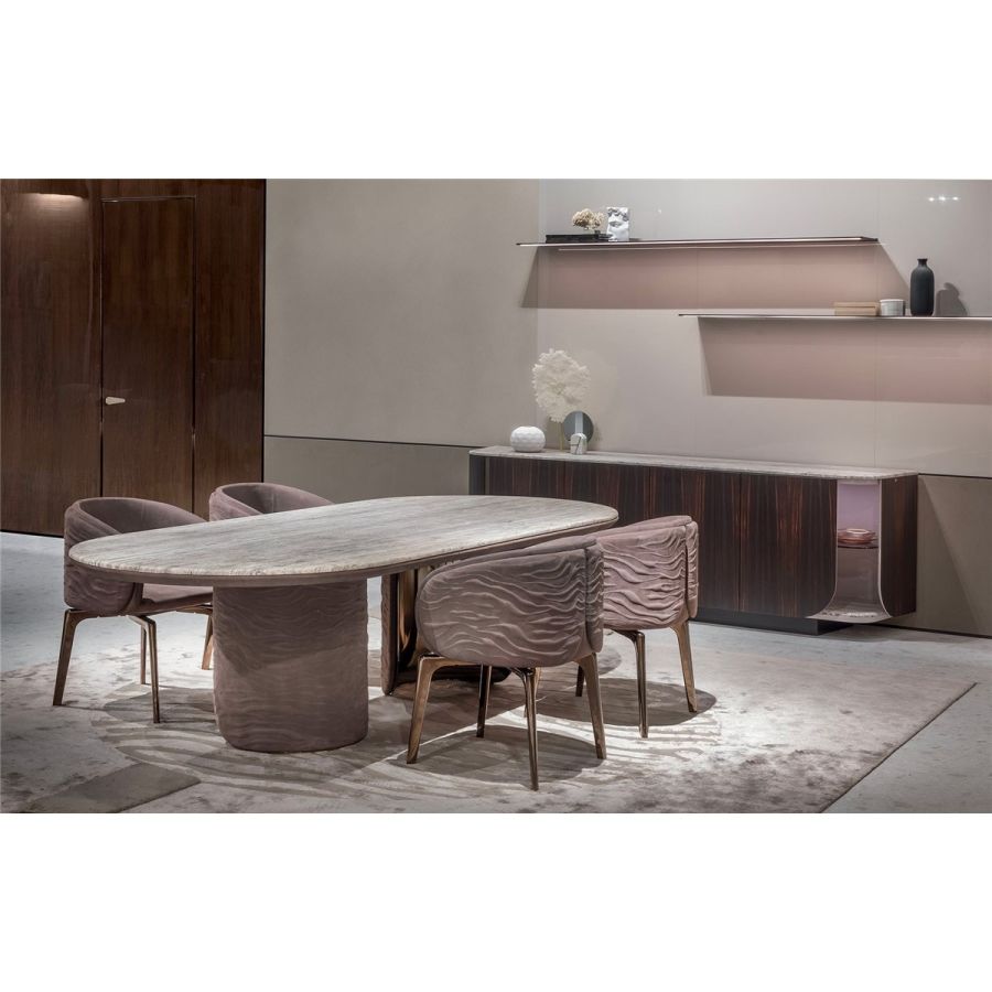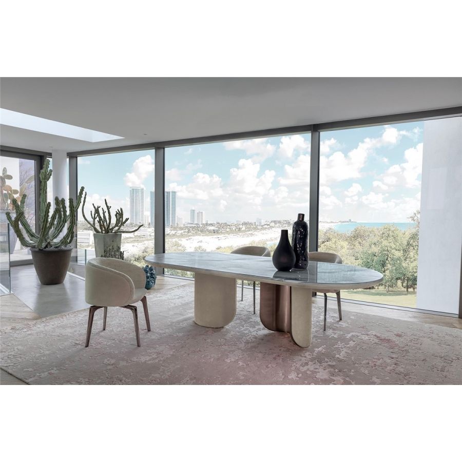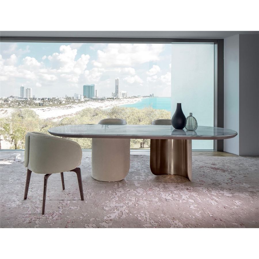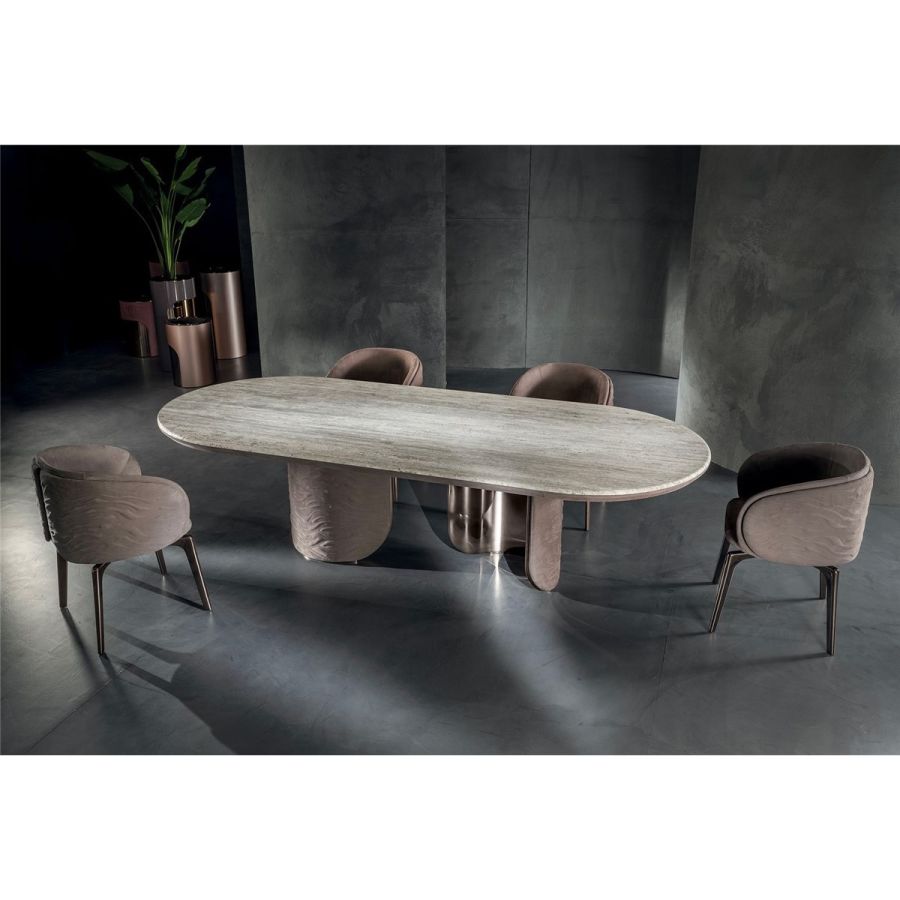 Oval or round table with two semi-circular load-bearing legs. The leg interiors are in metal: satinedChampagne, Bright/satined Burnished, Shaded copper, Bright/satined brown, Bright/satined Black rose,Bright/satined light gold, Bright/satined chrome, Bright/satined black chrome, Matt satined bronze.The leg exterior is covered in smooth or quilted leather, the “Groove” decoration, in the colours from the catalogue, or glossy lacquer from the catalogue, including the two exclusive colours “Quartz” and “Lilacgrey”. The under top is coordinated with the external finish of the leg. The top is in marble, 20 mm thick: Travertino, Silver Beola, Cipollino marble, Arabescato Orobico marble, Silver Stream marble, White Carrara marble, Imperial Brown marble, Elegant Brown marble, Sahara Noir marble (polyester finish), Dover White marble, Guatemala Green marble, Red Levanto marble, Shale Rosewood marble, Emperador Dark marble,Silver Wave marble, Agatha Black marble, Frappuccino marble, Calacatta marble, Patagonia marble, JulietQuartz marble.
