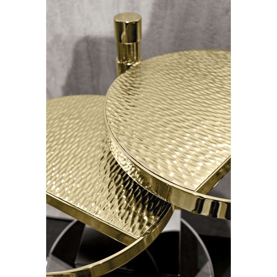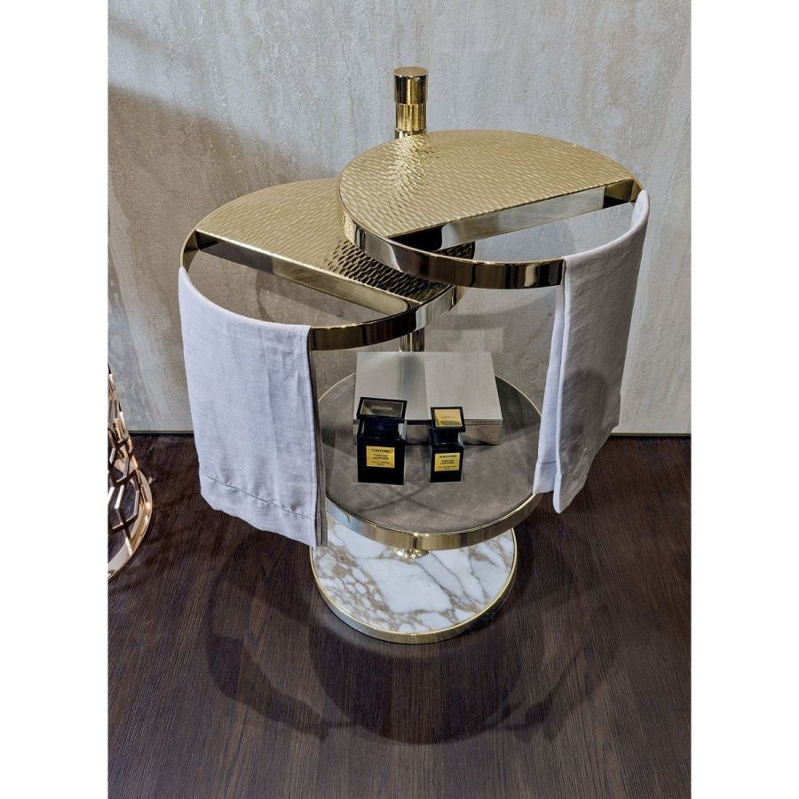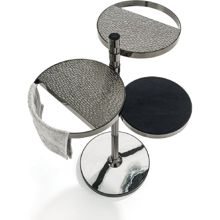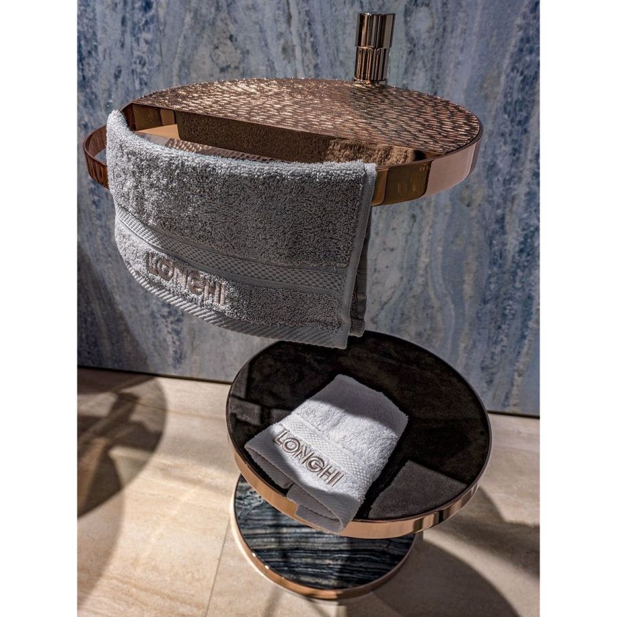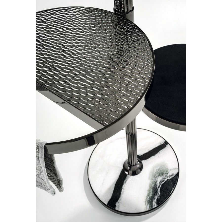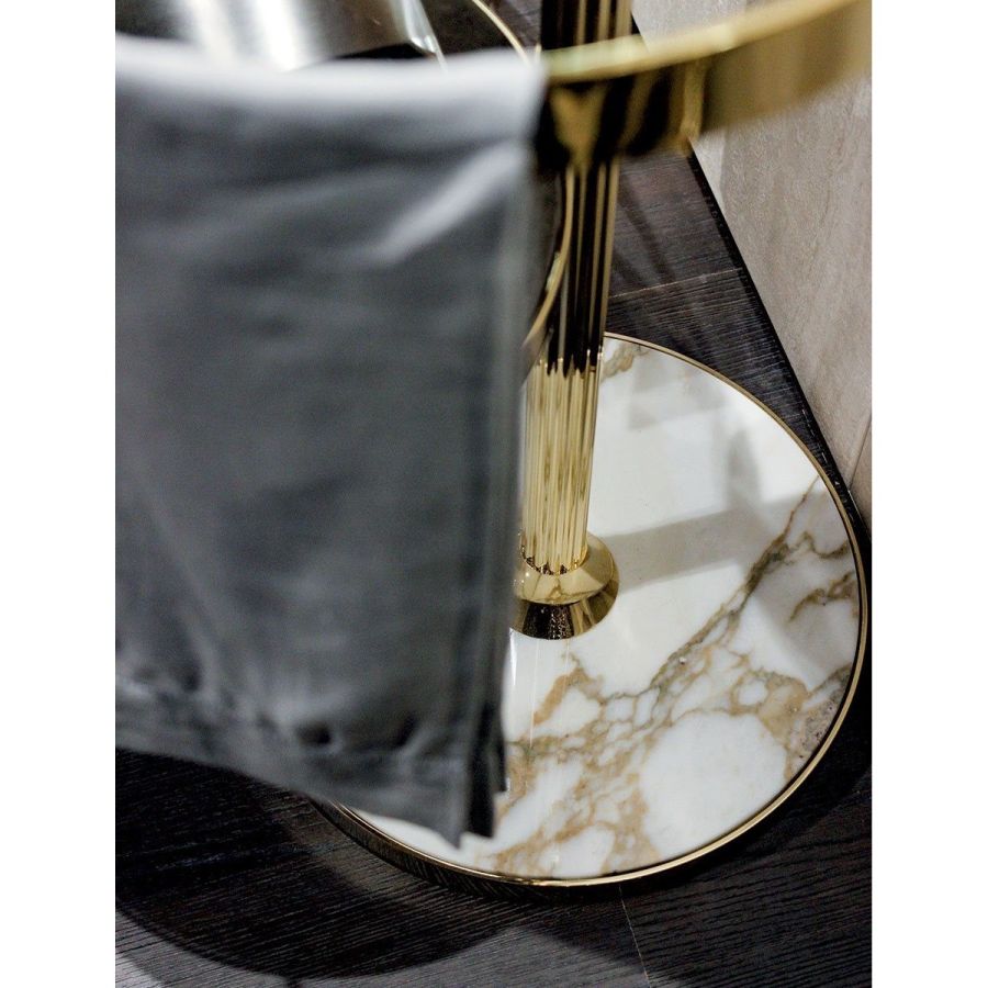 Towel rack with grooved metal structure, in the following finishes: Black Rose gold, bright shaded brown, bright light gold, matt Champagne gold, bright chrome, bright black chrome, matt satined bronze, bright pink gold, matt pink gold. Round base in marble: Azul Macauba marble, Portoro marble, Sahara Noir marble (polyester finish), Dover White marble, Panda White marble, Guatemala Green marble, Corteccia marble, Port Saint Laurent marble, Red Levanto marble, Bardiglio Nuvolato marble, Elegant Brown marble, Shale Rosewood marble, Emperador Dark marble, Silver Wave marble, Agatha Black marble, Frappuccino marble, Calacatta marble, Fusion Light marble, Patagonia marble, Explosion Blu marble, Fusion Multicolor marble, Juliet quartz marble, Calcite Azul marble. Movable shelves in hand-crafted engraved cast brass in colours gold, pink gold, and chrome, and round shelf upholstered in P.3 cat. Suede chamois.