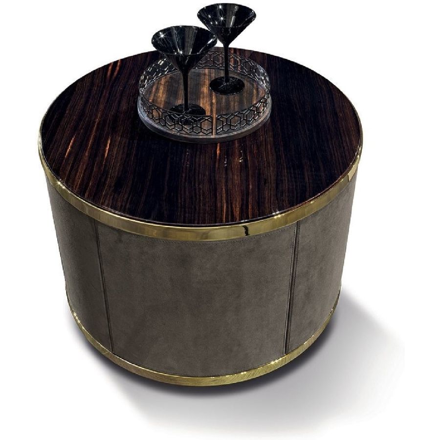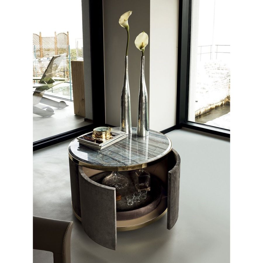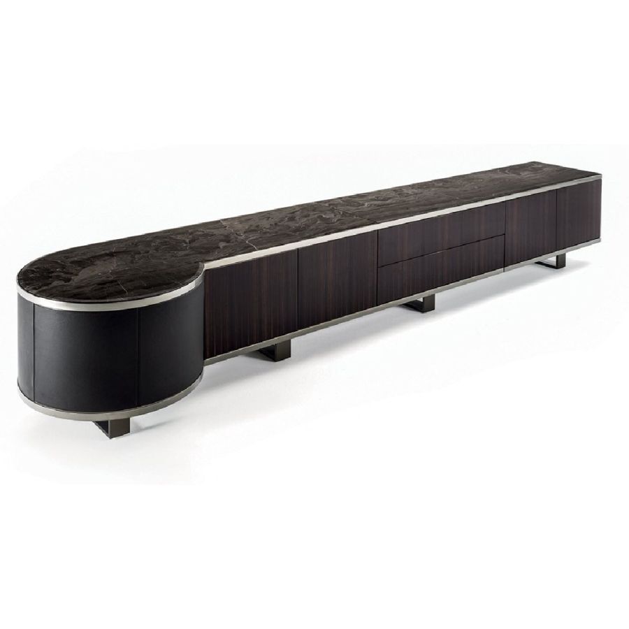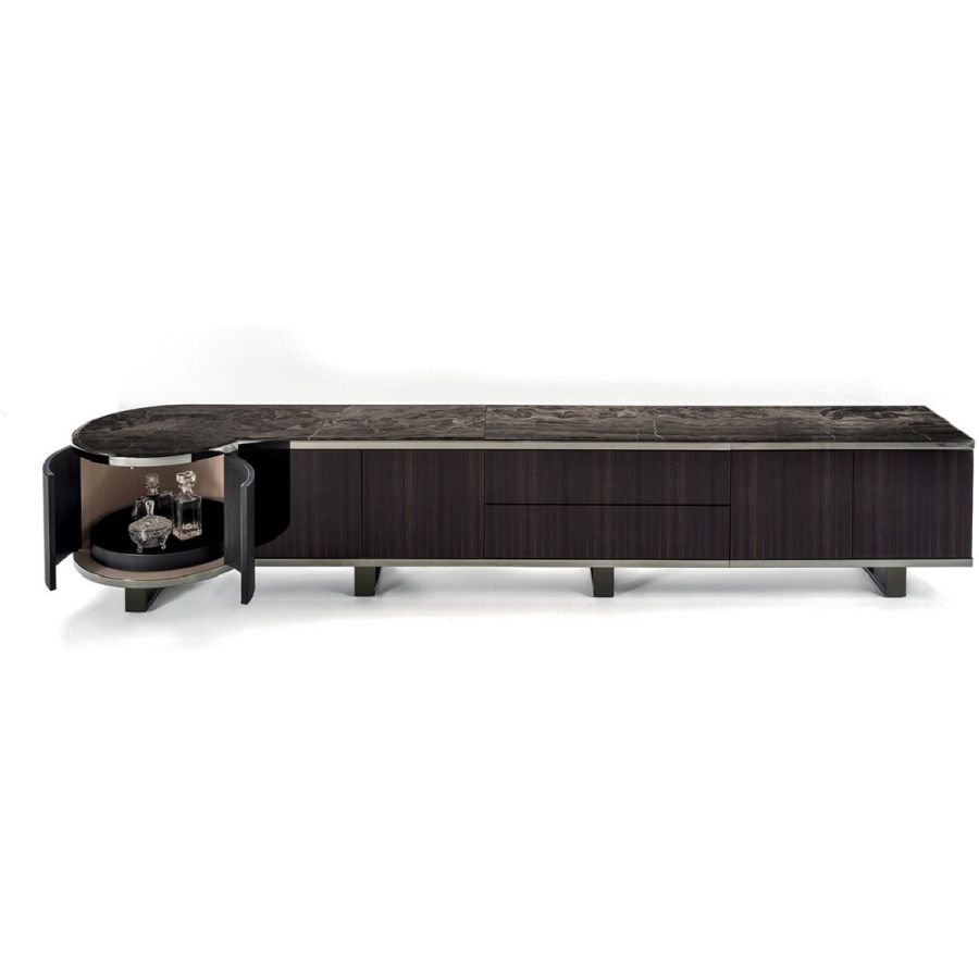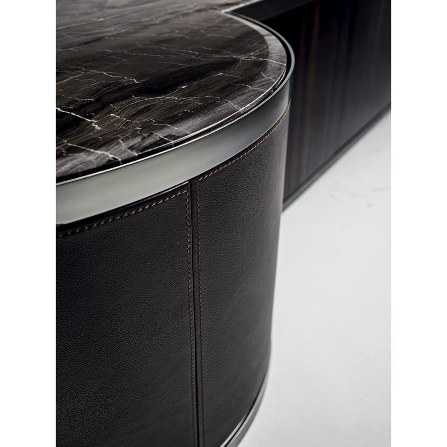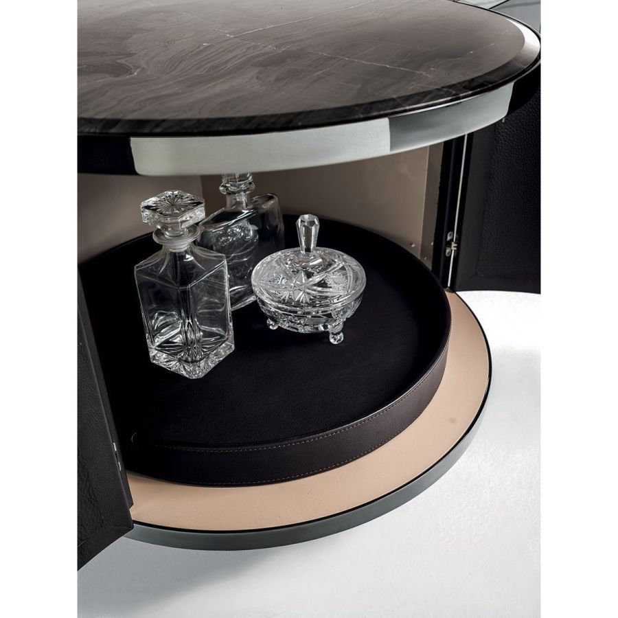 Living room unit with doors and drawers and structure upholstered in leathers from the catalogue or in wood in the finishes: Glossy/matt Ebony, glossy/matt Maple, glossy/matt heat-treated Eucalyptus, glossy/matt Sycamore frisè, glossy/matt Canaletto walnut, glossy Walnut Burl Wood. Ground metal edges in the following finishes: Satin nickel, bright shaded brown, Black Rose gold, bright pink gold, matt pink gold, bright light gold, matt Champagne gold, bright chrome, bright black chrome, matt satined bronze. The structure of the curved end element is available only covered in leather from the range. Top finishes: White Carrara marble, Imperial Brown marble, Sahara Noir marble (glossy and matt polyester finish), Dover White marble, Panda White marble, Guatemala Green marble, Corteccia marble, Port Saint Laurent marble, Red Levanto marble, Bardiglio Nuvolato marble, Elegant Brown marble, Shale Rosewood marble, Emperador Dark marble, Silver Wave marble, Agatha Black marble, Frappuccino marble, Calacatta marble, Fusion Light marble, Patagonia marble, Explosion Blue marble, Fusion Multicolor marble, Juliet Quartz marble. Or in wood veneering. Push-pull opening mechanisms and interiors painted bronze. The base is made up of metal legs painted bronze. The inside of the rounded end element and of the island is bright lacquered in powder colour, and there is a turning and revolving tray upholstered in leathers from the catalogue (matching the structure), and an automatic LED light.