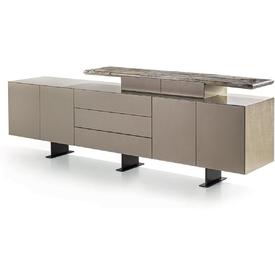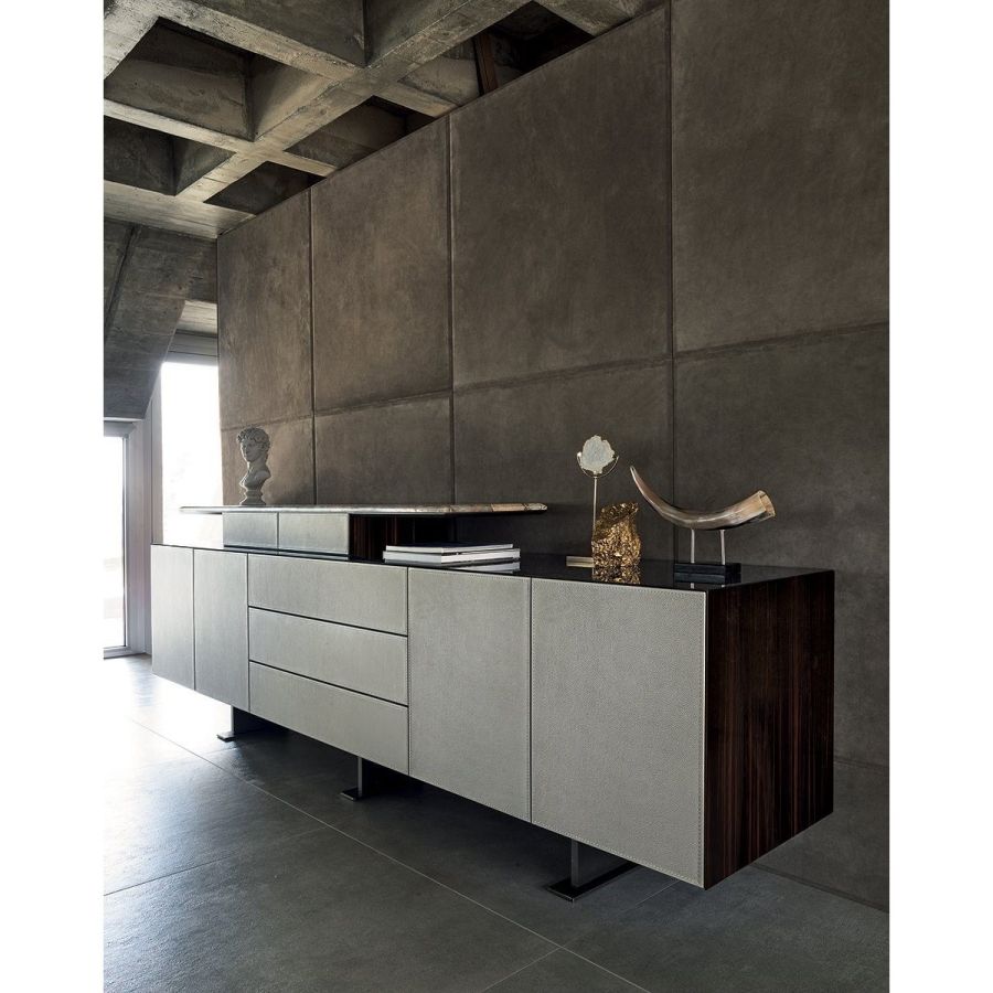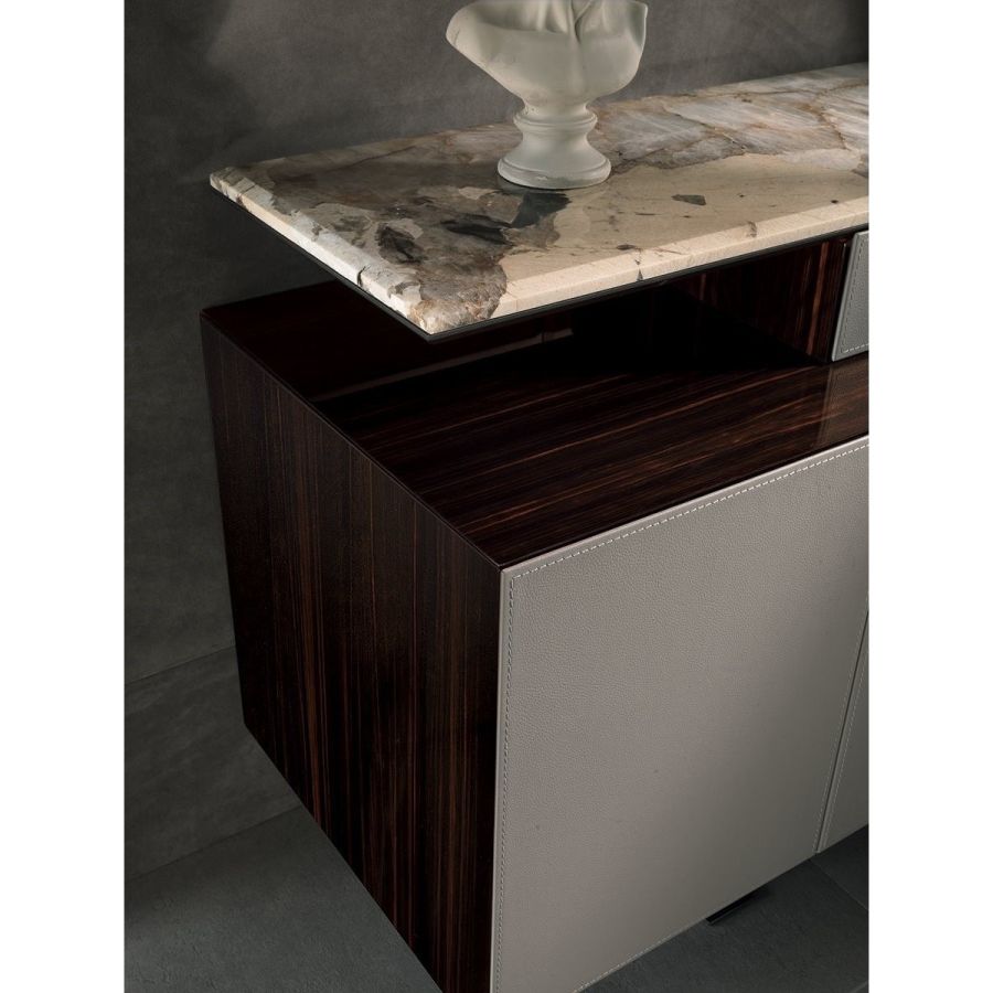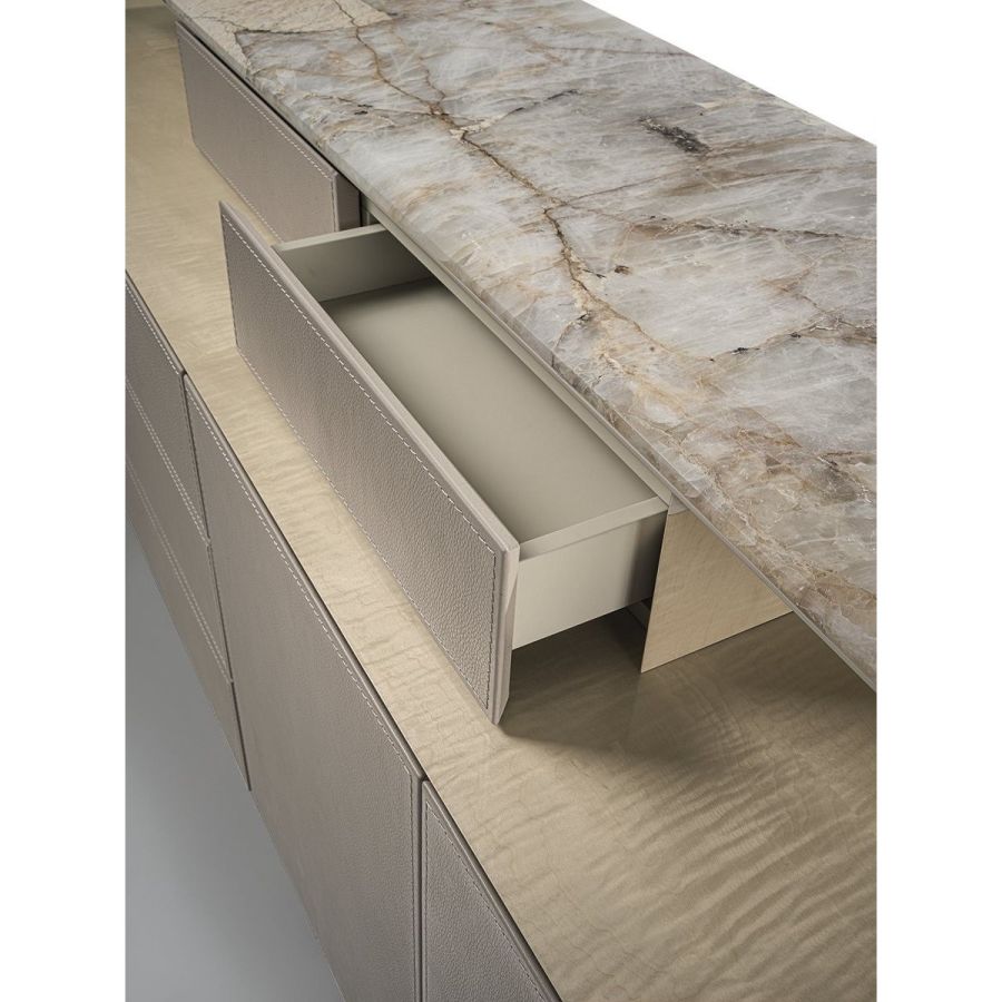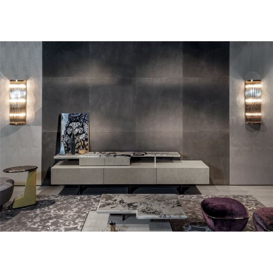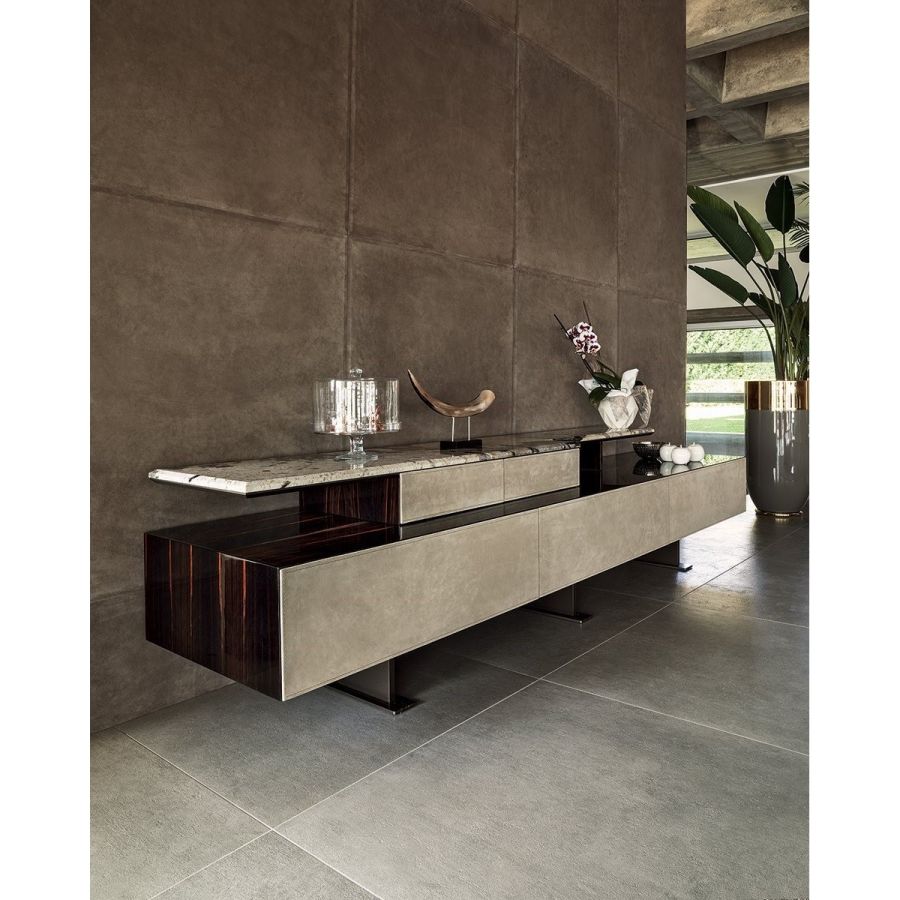 Collection of living room cabinets available in two heights, made up of a storage element with doors anddrawers (the low variant comes with drawers only) and a shelf set on 2 small drawers. Base in aluminium painted bronze. Sides and top in wood: glossy/matt Maple, glossy/matt heat-treated Eucalyptus, glossy/matt Sycamore frisè, glossy/matt Ebony, glossy/matt Canaletto walnut or glossy lacquered wood in coloursfrom the range. Drawer fronts upholstered in leathers from the catalogue. Shelf in the finishes: bronze or smoky mirror. Marble: White Carrara marble, Imperial Brown marble, Portoro marble (divided into 2 pcs.), Sahara Noir marble (polyester finish), Dover White marble, Panda White marble,Guatemala Green marble, Corteccia marble, Port Saint Laurent marble, Red Levanto marble, Bardiglio Nuvolato marble, Elegant Brown marble, Shale Rosewood marble, Emperador Dark marble, Silver Wave marble, Agatha Black marble, Frappuccino marble, Calacatta marble, Fusion Light marble, Patagonia marble,Explosion Blu marble, Fusion Multicolor marble, Juliet quartz marble. Push-pull opening. Interiors are lacquered in matt bronze.