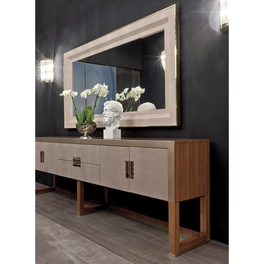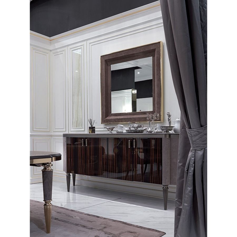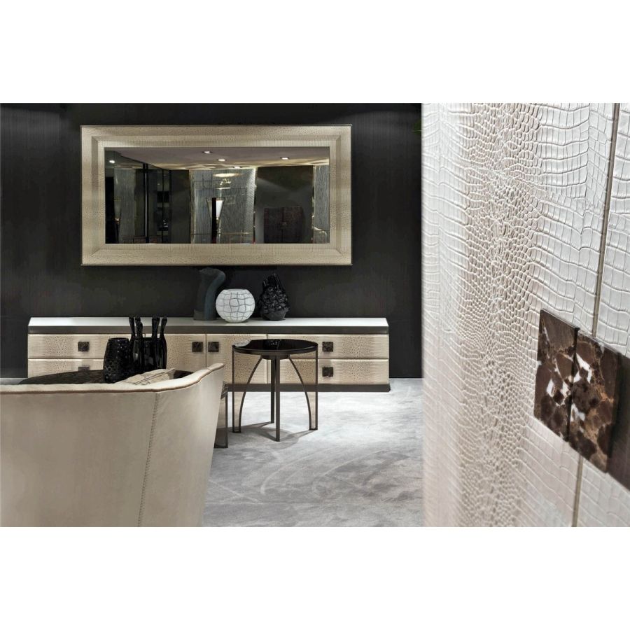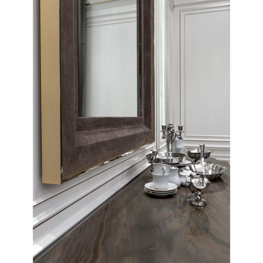 Ground metal borders finished in: Black Rose gold, bright shaded brown, bright light gold, matt Champagne gold, bright chrome, bright black chrome, matt satin bronze, bright pink gold, matt pink gold. Cornice covered in leather.