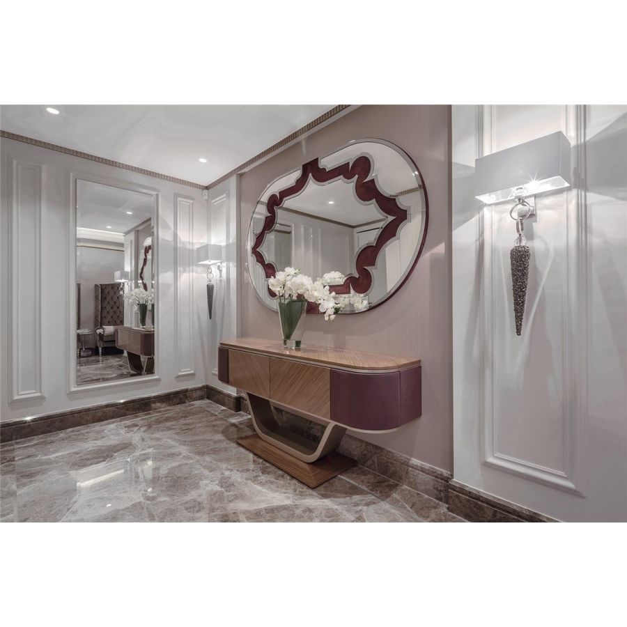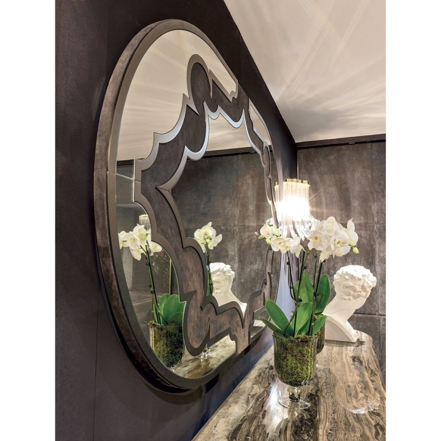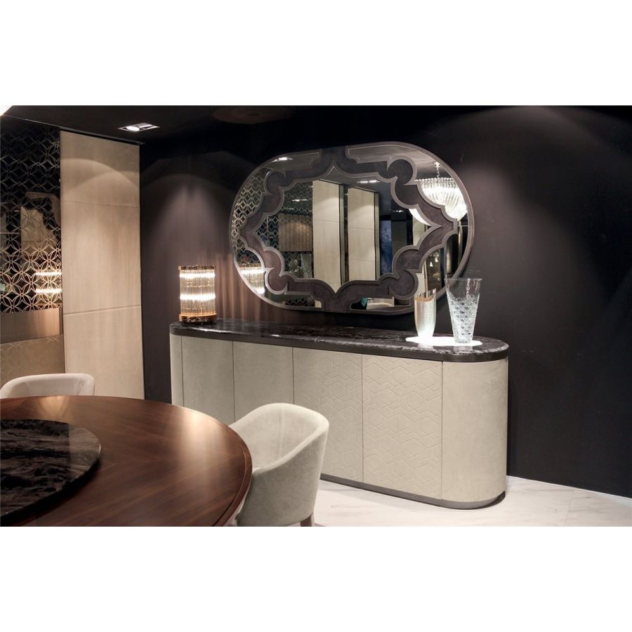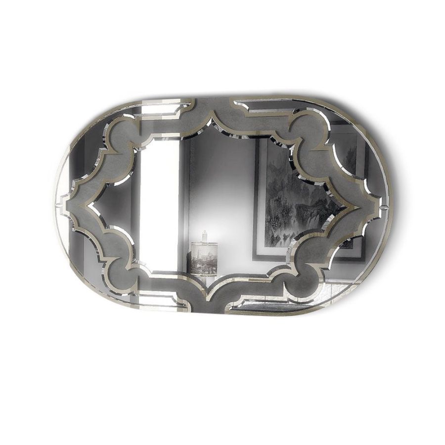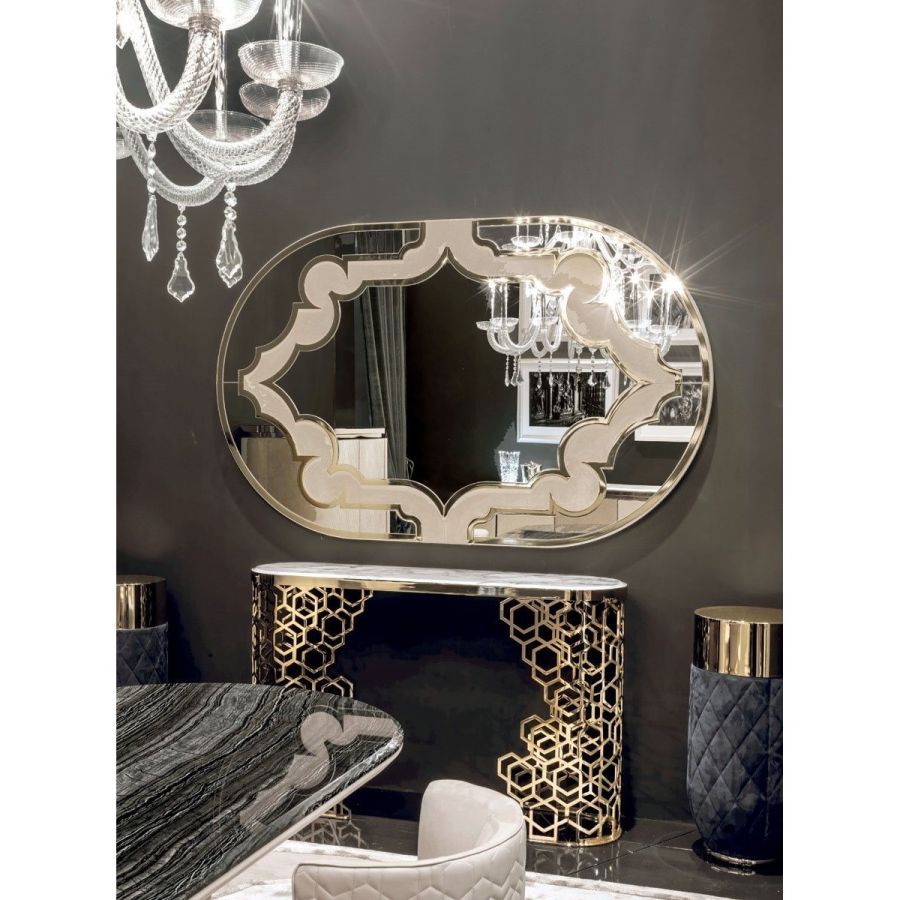 Large oval mirror. Particular attention has been devoted to finding the design of the internal frame covered in suede.