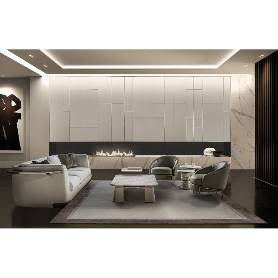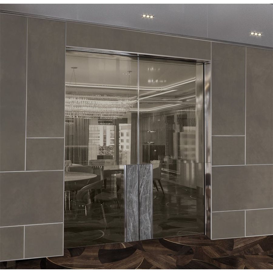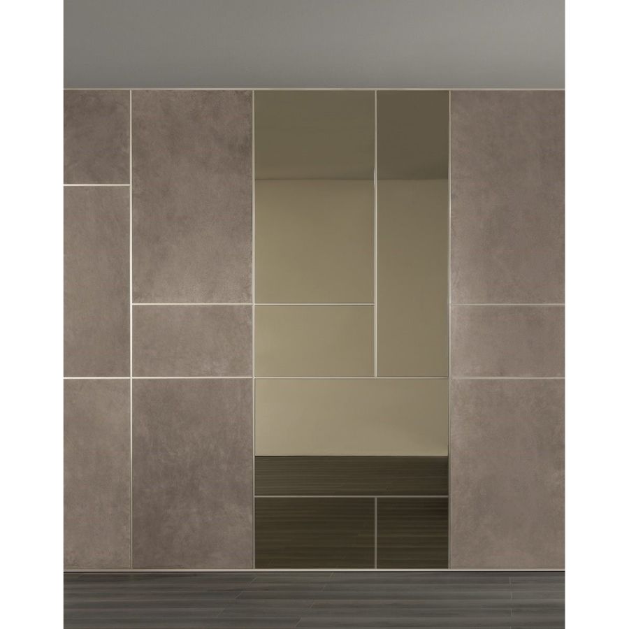 The Land Boiserie is a modular system that combines doors, sliding panel and boiserie panels. It is extremely adaptable to any type of environment and for the materials used. The series includes many combinations and the modularity of the almost personalised dimensions. BOISERIE MODULES Profiles in aluminium: Matt platinum, Matt satined bronze, Bright, Bright gold, Champagne bright gold, Bright electrocolour dark brown, Matt electrocolour black, Glossy white. All in cork in range colours, All in wood: glossy/matt ebony, glossy/matt Canaletto walnut or glossy/matt Sycamore frisè, All in Cat. P.3 Suede/Tecnosuede leather, natural, bronze or smoky mirror, plain coloured tempered glass in the colours white, canapé, rope, turtle dove, coffee, moka, cement grey, slate grey and black, mixed finishes: upper half in wood, glass or mirror and lower half in leather cat. P.3 Suede/Tecnosuede. mixed finish: etched smoky or bronze mirror alternated with smoky or bronze mirror; mixed finish: matt satined gold steel alternated with bright gold steel, matt satined black chrome steel alternated with bright black chrome, matt satined chrome steel alternated with bright chrome.