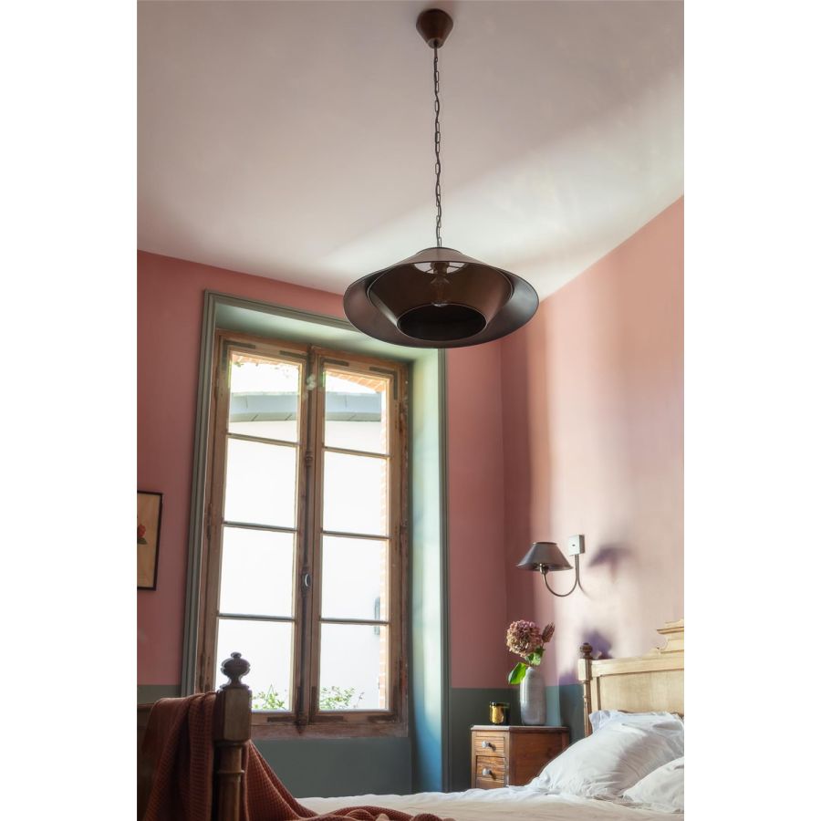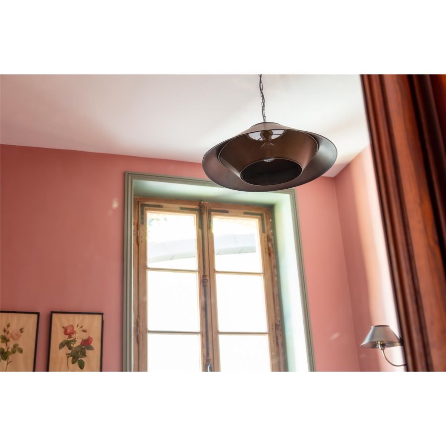 The Coursive pendant combines a first conical element in solid brass with a return in micro-perforated brass to give it a discreetly contemporary air. To be placed preferably in series for a repetition effect. This pendant is supplied with chain and canopy.