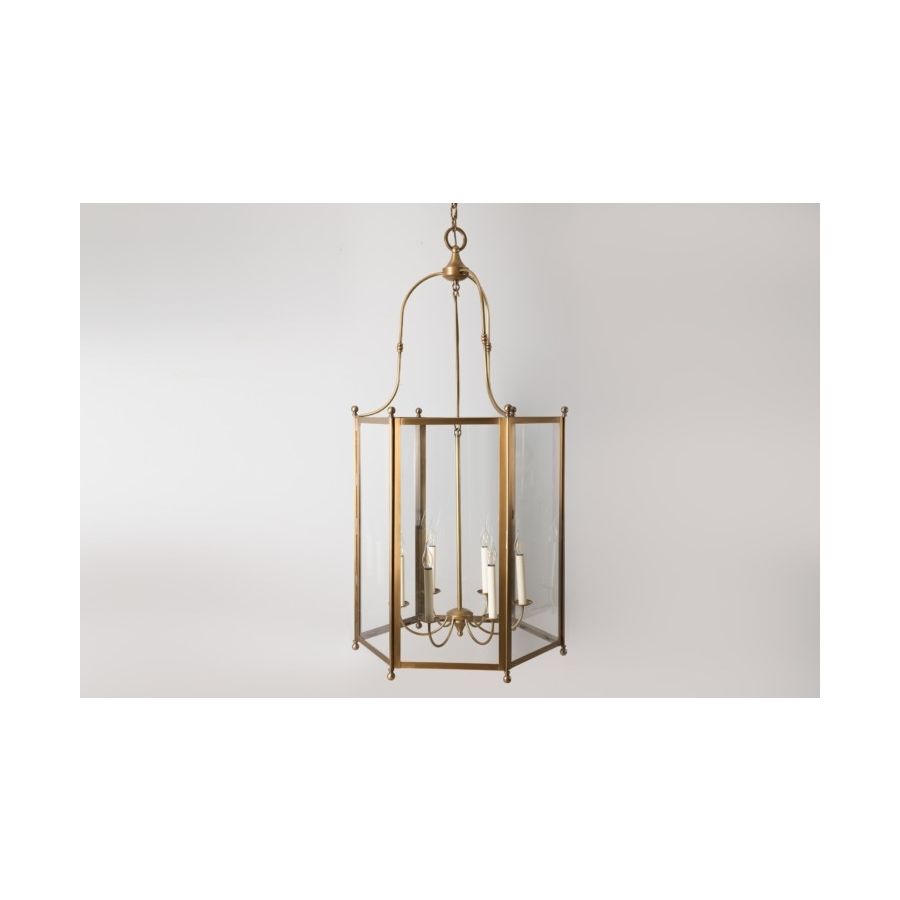 Inspired by 19th century lanterns but with a very simple design, the Directoire Collection includes interior hanging lanterns and matching wall lights. A fluid design and sophisticated brass balls subtly encase the body of the lanterns in this collection. Depending on the size, the swing arm supports three to six lights. The lamps are ideal for entrances, lobbies, galleries, and hallways. Lantern delivered with chain and ceiling cup.