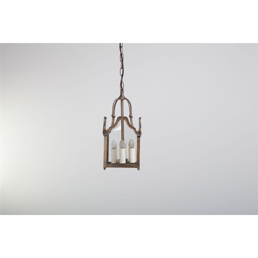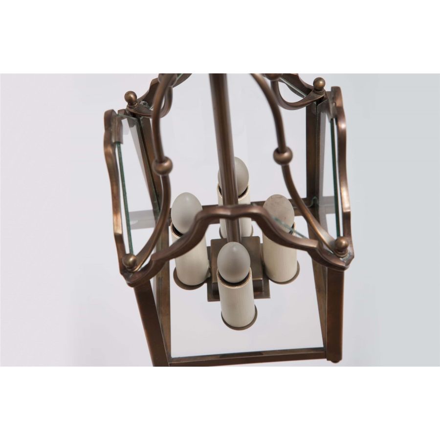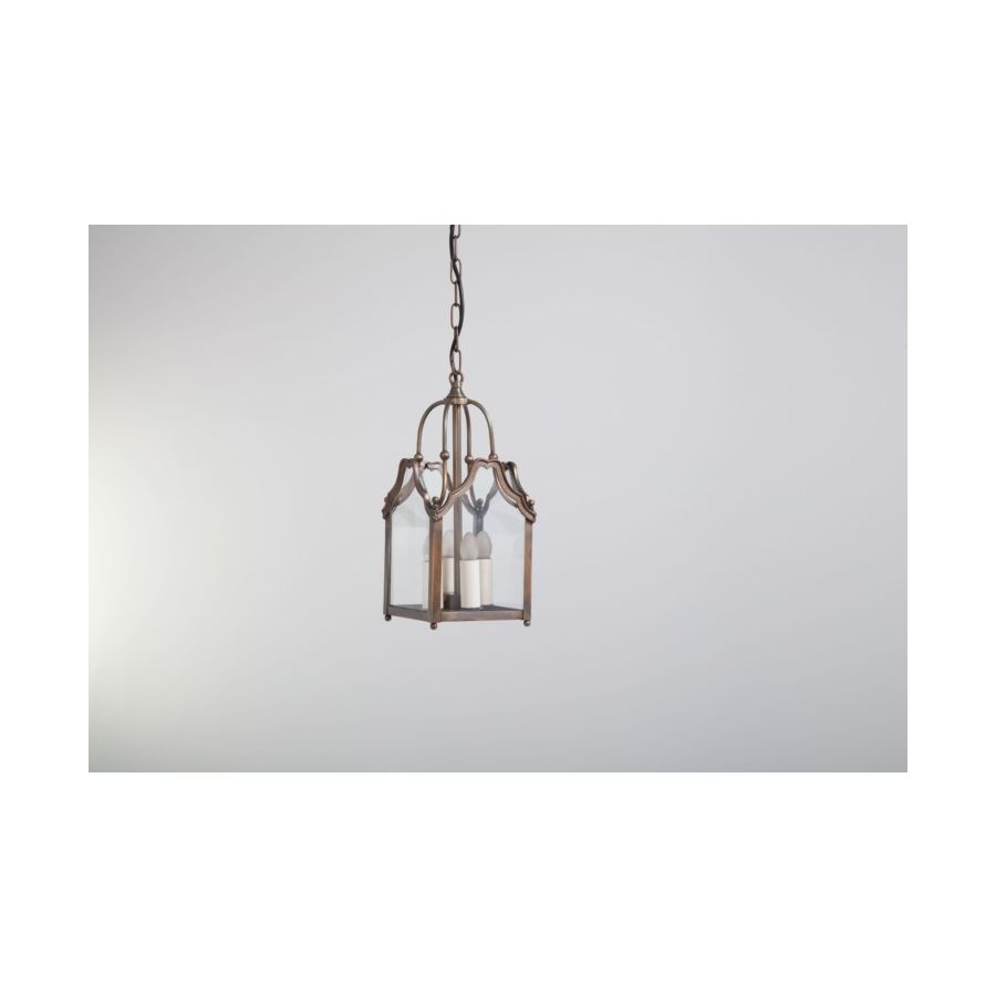 17th-century spirit for this collection of indoor lanterns and matching wall sconces. The frame of these lanterns, square-shaped, is subtly edged with a scrollwork entirely in curves. Also one of the smallest lanterns in our collections for the smallest of sizes. Ideally suited to residence entrances, halls, galleries and corridors. This lantern is supplied with chain and canopy.