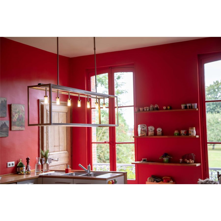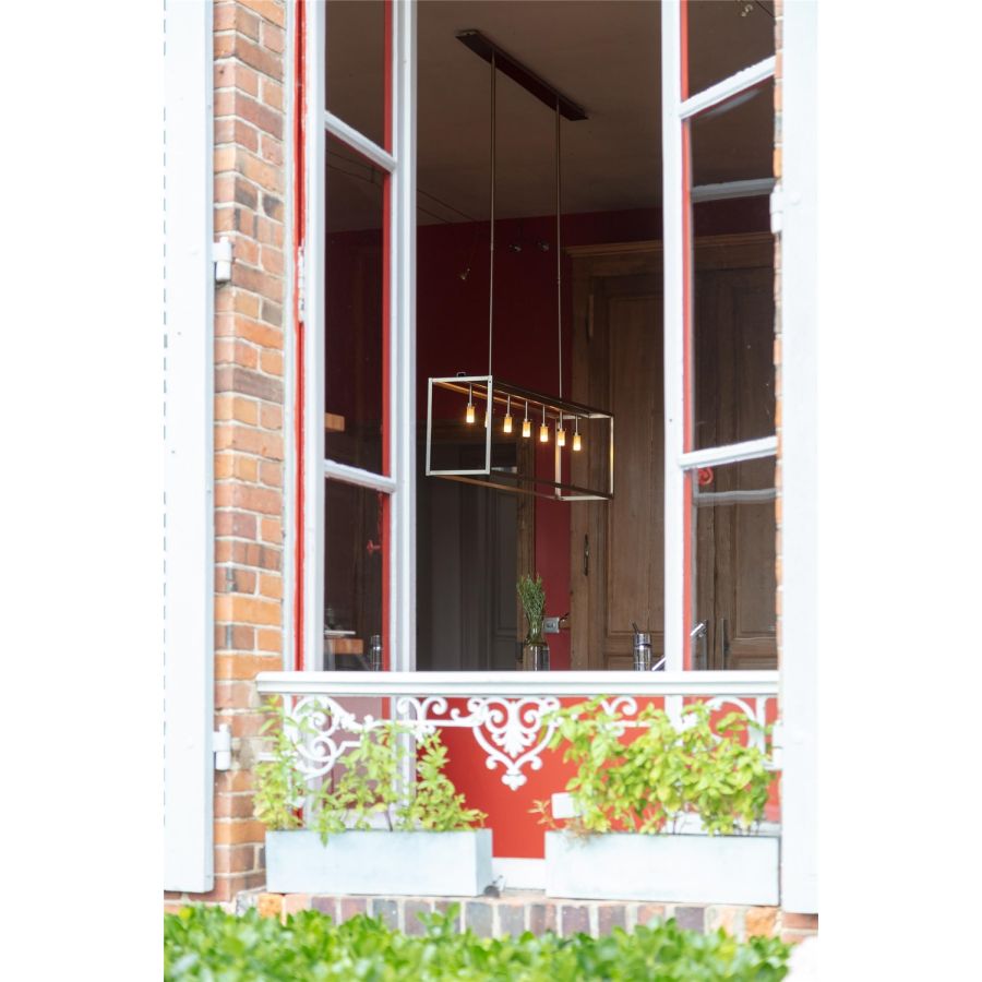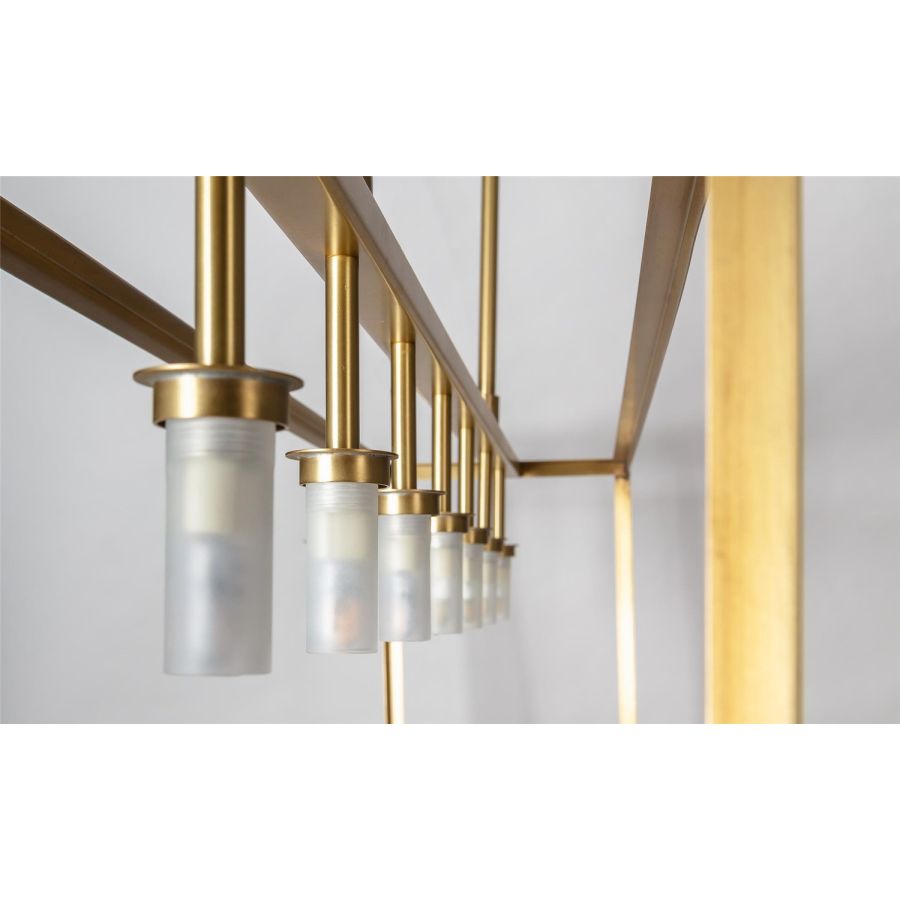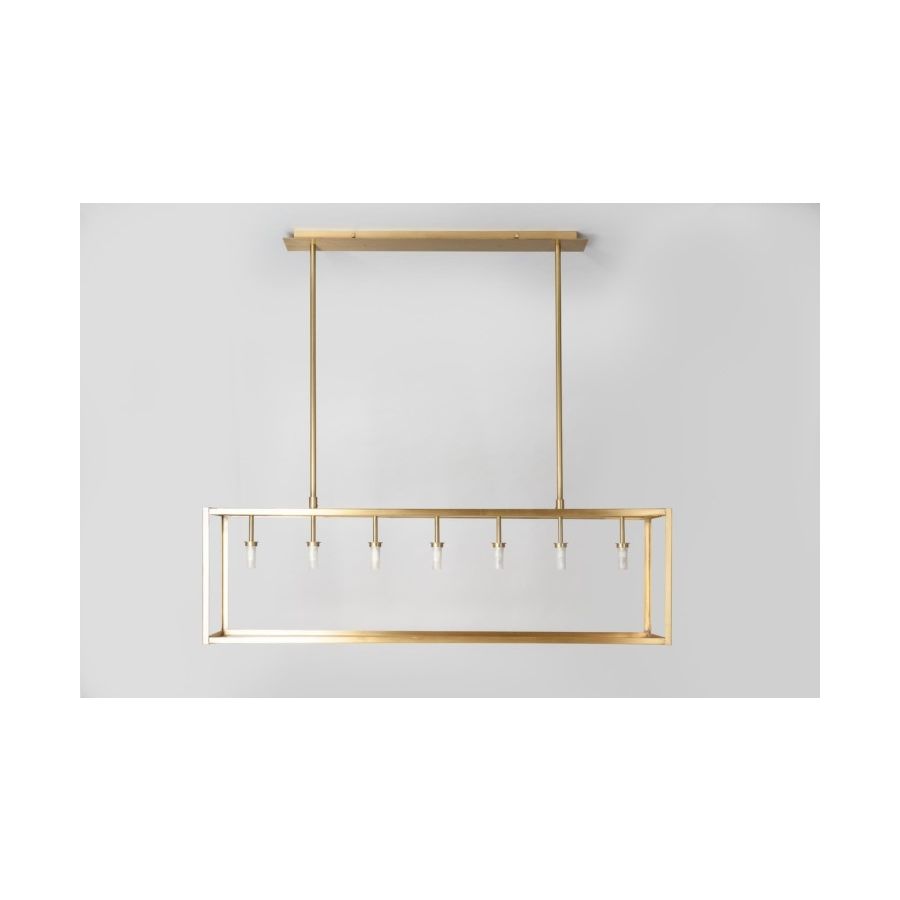 This modern and sleek collection of chandeliers and wall lights has no glass frame, only a brass structure holds the two, five or seven lights of the chandelier, which are themselves encased in a sandblasted cylinder. With a large flexibility in terms of height adjustment, you can position the chandelier at the precise distance you want from your table or workspace. Integrate it into a classic décor for a daring contrast!