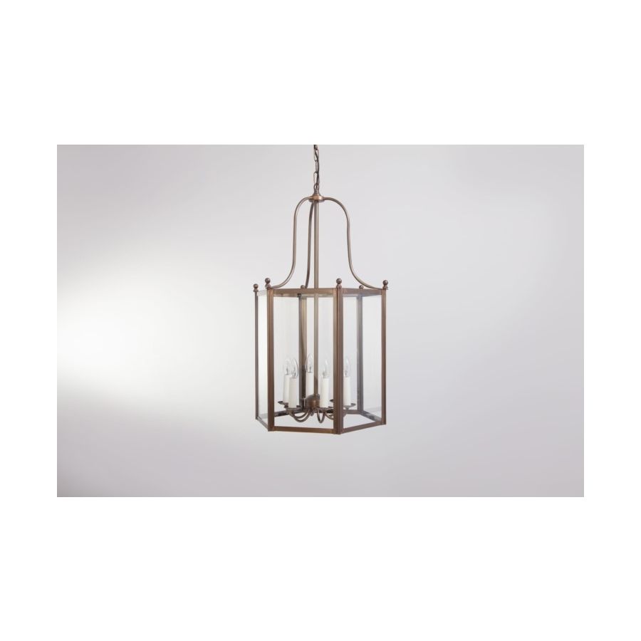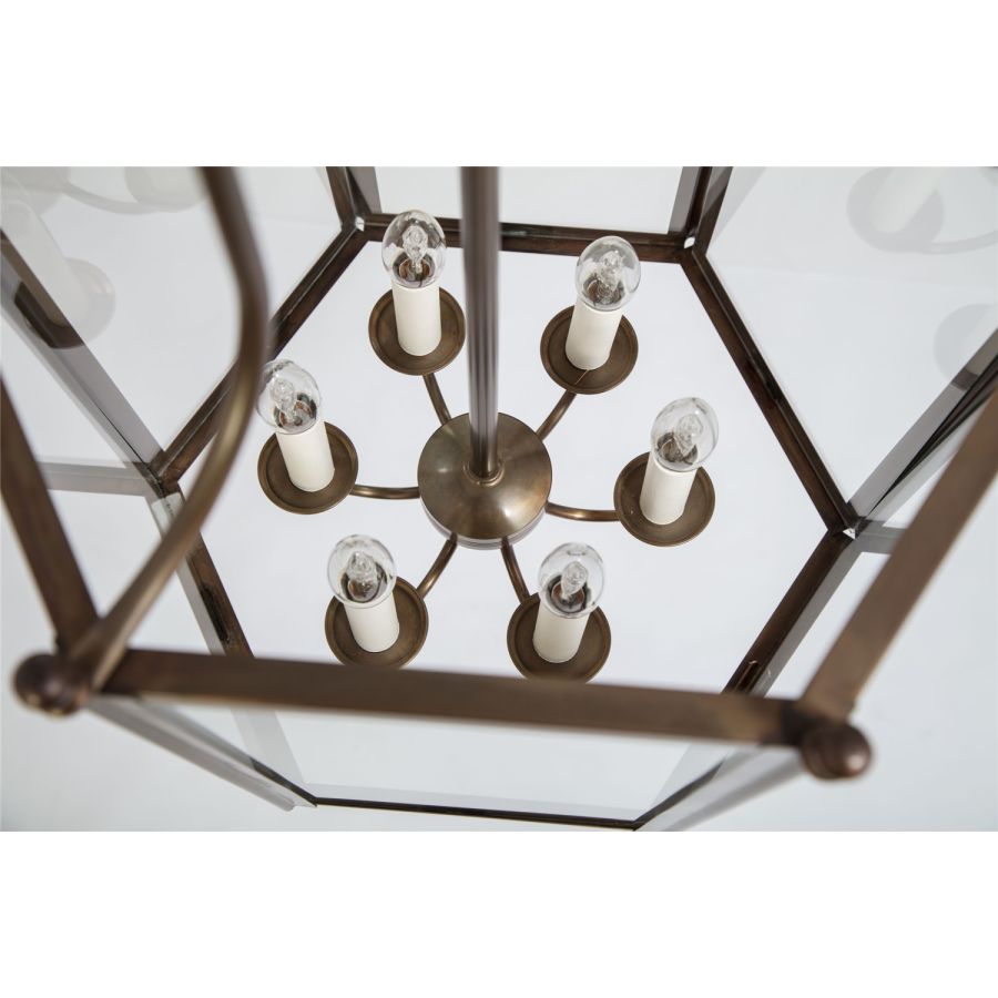 Of 19th-century inspiration but of great sobriety, the Rivoli collection is ideally suited to the entrances of residences, halls, galleries and corridors. Of hexagonal shape, only the 6 brass balls that hold the cage of the lantern, come to punctuate the fluidity of the lines of this grand classic. This lantern is delivered with chain and canopy.