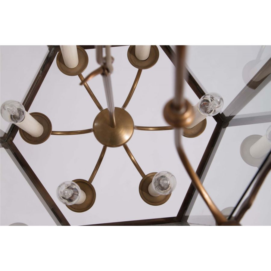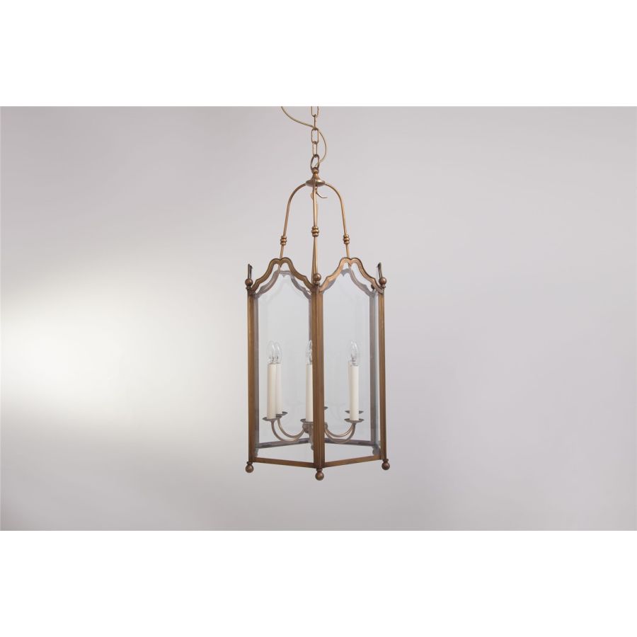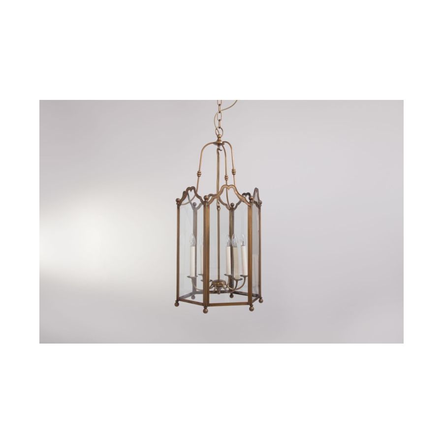 17th-century spirit for this collection of interior lanterns. The frame of these six-sided lanterns is subtly enhanced with delicately wrought scrolls, surmounted by brass balls. The chandelier, with 3 or 6 lights depending on the size, is articulated within this transparent cage. Ideally suited to residence entrances, halls, galleries and corridors. This lantern is delivered with chain and canopy.