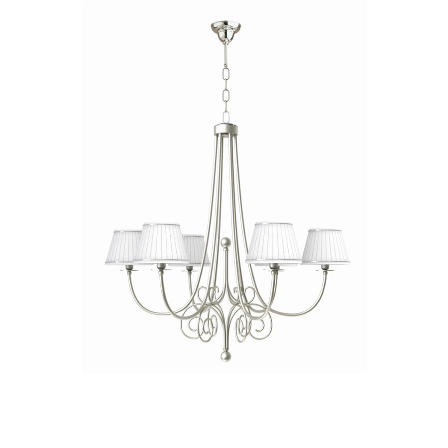 Perfectly suited for furnishing bedrooms, corridors and living areas, these items share a metal structure decorated with antiqued silver leaf. Specifically, this chandelier is proposed with six conical lampshades in white pleated fabric.