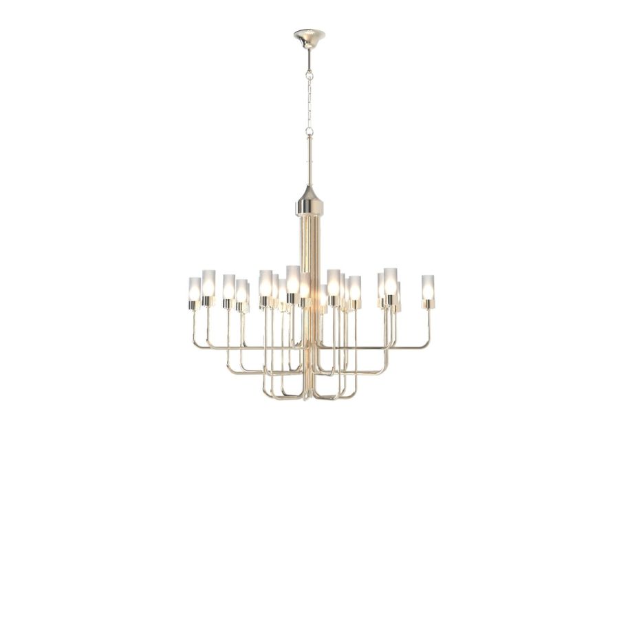 Inspired by a contemporary and refined design, this chandelier, ideal for living rooms and living areas, is composed of a central structure of 24 brass arms in a refined light gold finish, completed in the final part by sandblasted glass details, it is a clear example of aesthetics. and application functionality.