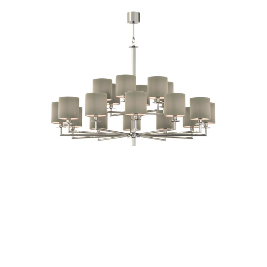 Inspired by a classic and refined design, this chandelier ideal for living rooms and living areas is a clear example of aesthetic and practical functionality. Composed of a structure and 18 arms in brass with a polished nickel finish, surmounted by as many cylindrical lampshades in ivory fabric.