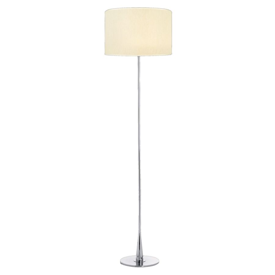 Made up of an immediate design structure in chromed metal (available in chrome, nickel and light gold finishes) and a cylindrical lampshade in ivory fabric, this floor item fits perfectly in bedrooms and common areas.