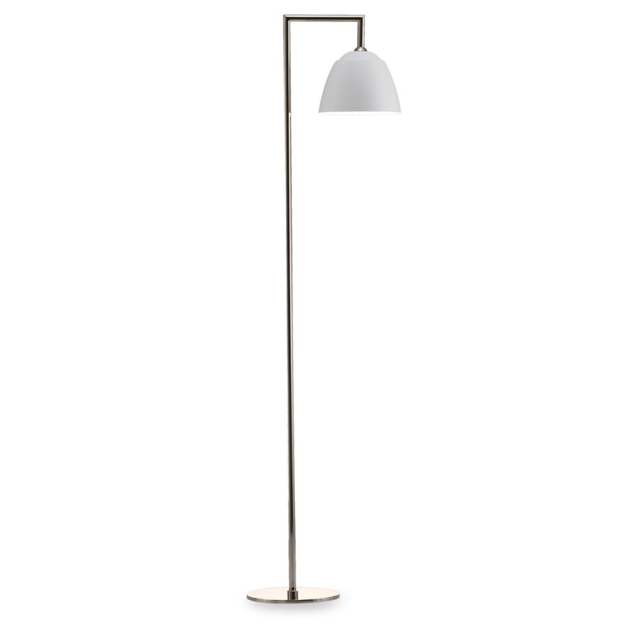 The floor-standing item consists of a structure made of polished nickel-finish brass and a painted metal lampshade, presented in white or black. Excellent for decorating and enhancing the interiors of bedrooms and living areas. Available in different variations of colors and finishes.w