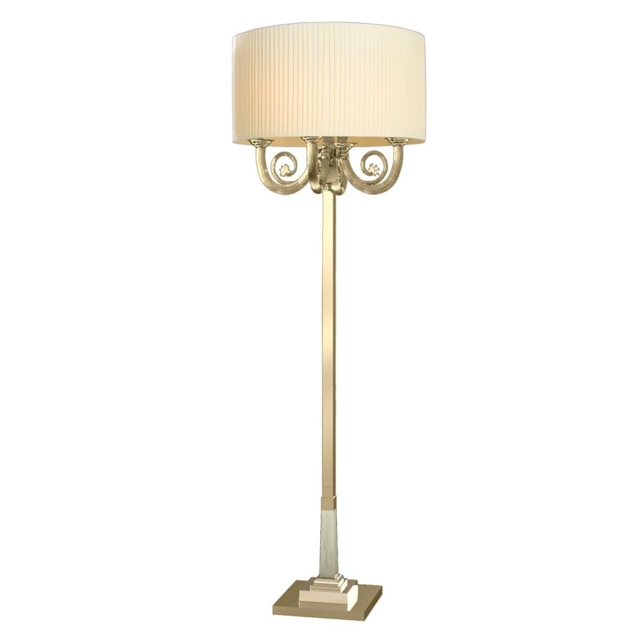 Available in various fabrics and finishes, this floor model with 4 bulbs and light gold-finish brass structure, features a cylindrical lampshade in off-white pleated fabric.