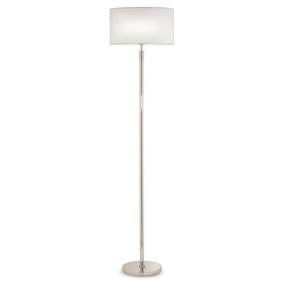 Floor lamp consisting of a round base, a linear body in polished nickel finish brass and upright a cylindrical lampshade in white fabric.