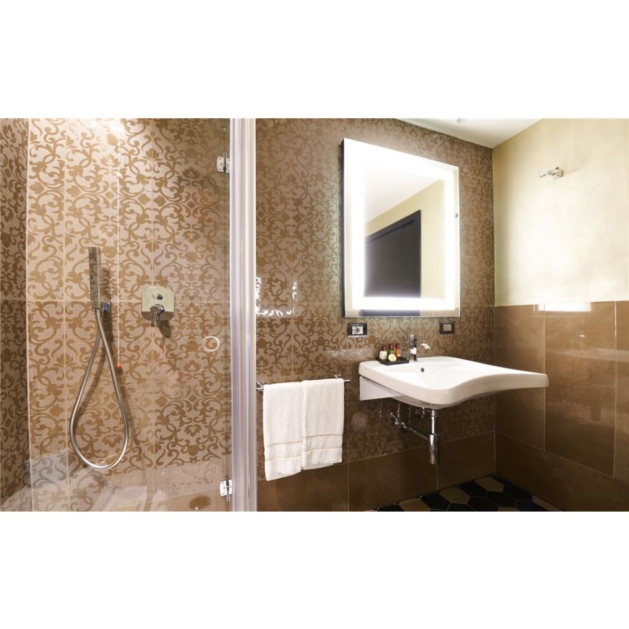 This luminous mirror, made with a chrome finish brass structure with an elegant design and a contemporary style, is ideal for any type of bathroom in a hotel, restaurant or residence.
