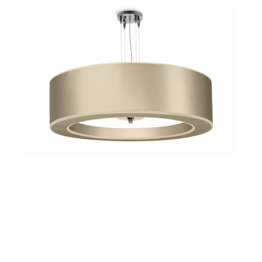 Strong of a great balanced aesthetic sense, this suspension is composed of a metal structure in chrome finish and a cylindrical lampshade in ivory fabric, complete with lower glass diffuser. Available in various colors.