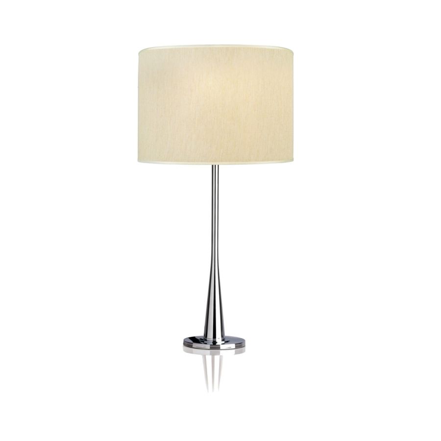 Made up of an immediate design structure in chromed metal (available in chrome, nickel and light gold finishes) and a cylindrical lampshade in ivory fabric, this table or bedside table item fits perfectly in bedrooms and common areas.
