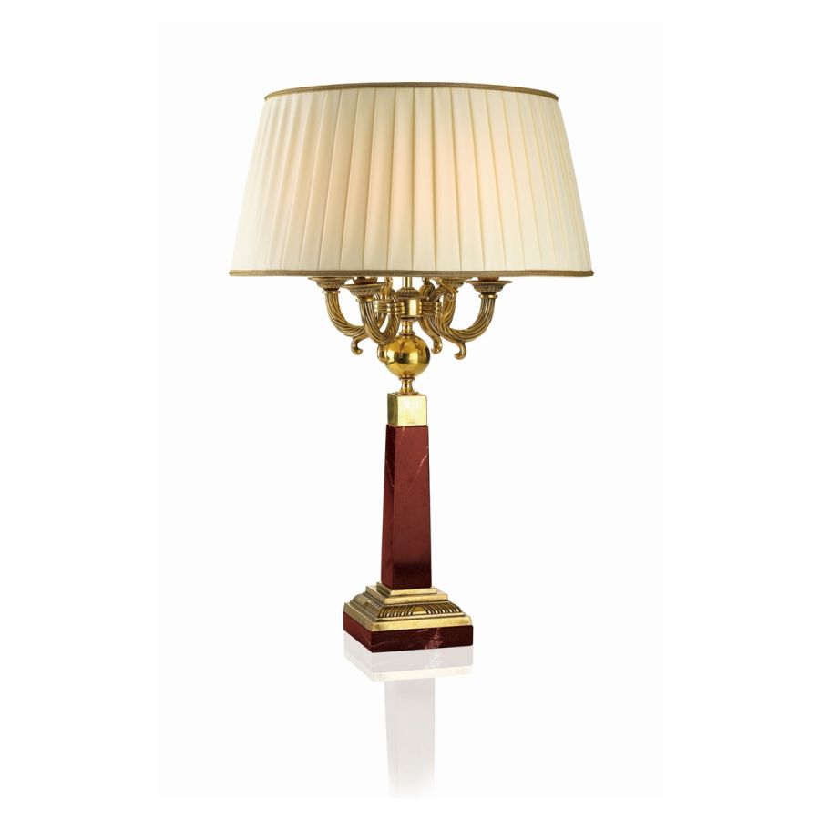 Characterized by a structure in antiqued brass and red marble, enriched with details in cast brass. This luminous body is completed by four light points on arms with unique details and a conical lampshade in ivory pleated fabric.