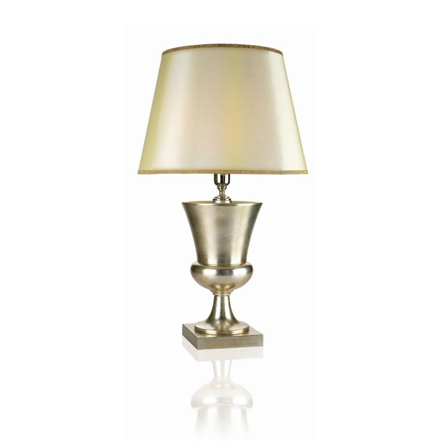 This luminous desk body of classic design, with wooden structure decorated with antiqued silver leaf, completed with a conical lampshade in ivory fabric, is perfect for lighting a bedroom, a dining room or a living room. Available in various colors.