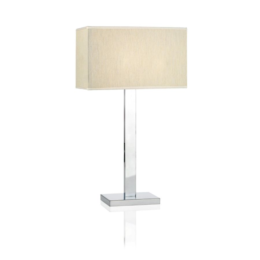 This specific model is presented as a table lamp in chrome finish brass, with a rectangular lampshade in ivory colored fabric.