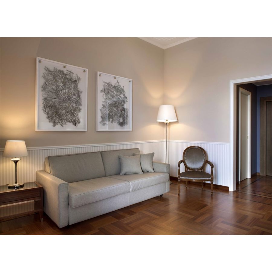 Formed by a vertical brass stem, the diameter of which shrinks downwards and by a conical lampshade in ivory fabric. This table, bedside table and desk model in light gold finish is a perfect match for bedrooms, corridors and common areas.