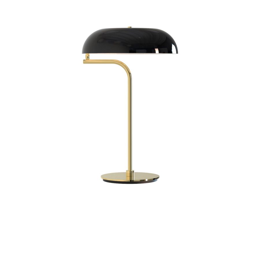 With a light gold structure and base and two-tone painted metal cap (black exterior and white interior), this table model with a round base is an excellent match for tables, desks, halls and common areas.