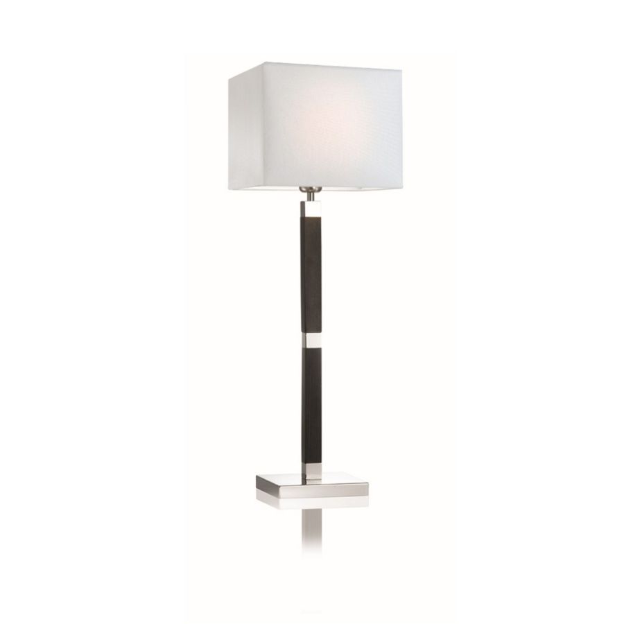 Made up of a brass structure with a polished nickel finish and enriched with wenge-colored wood details, this table lamp, desk and bedside table for bedrooms, corridors and common areas is completed by a square lampshade in white fabric.