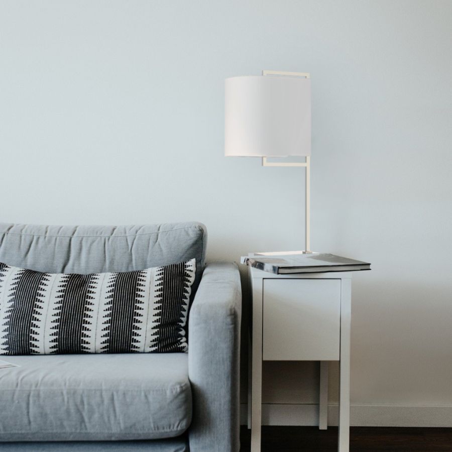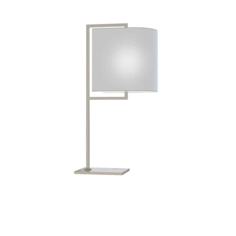 Table lamp of contemporary and refined design for bedrooms, corridors and common areas, with structure composed of a rectangular frame and fixing base in brass with polished nickel finish. Shaped lampshade in white fabric. Available in various colors.