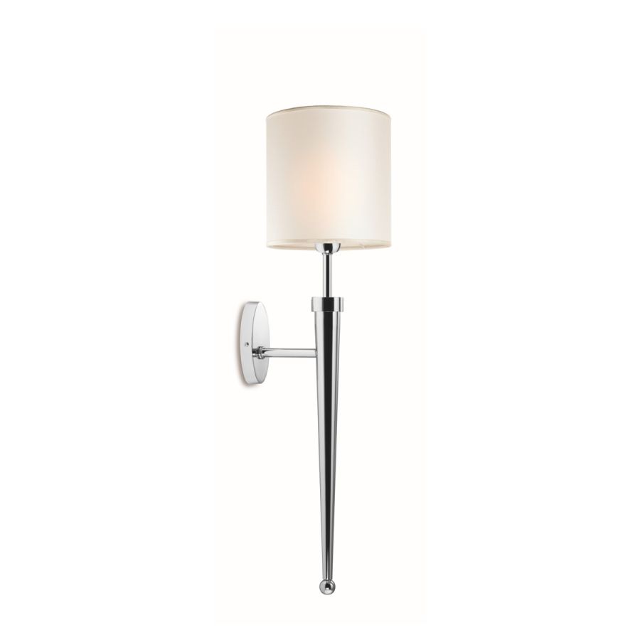 The particular construction of this wall model, in brass with a chrome finish and with a slightly conical shape, fits perfectly with the cylindrical lampshade in matching ivory fabric.