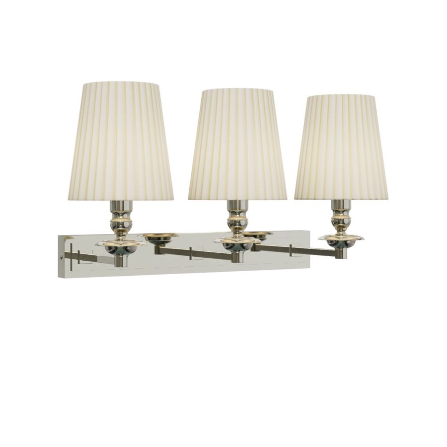 This wall item with brass structure in polished nickel finish, has three light points enclosed by as many conical lampshades in ivory pleated fabric.