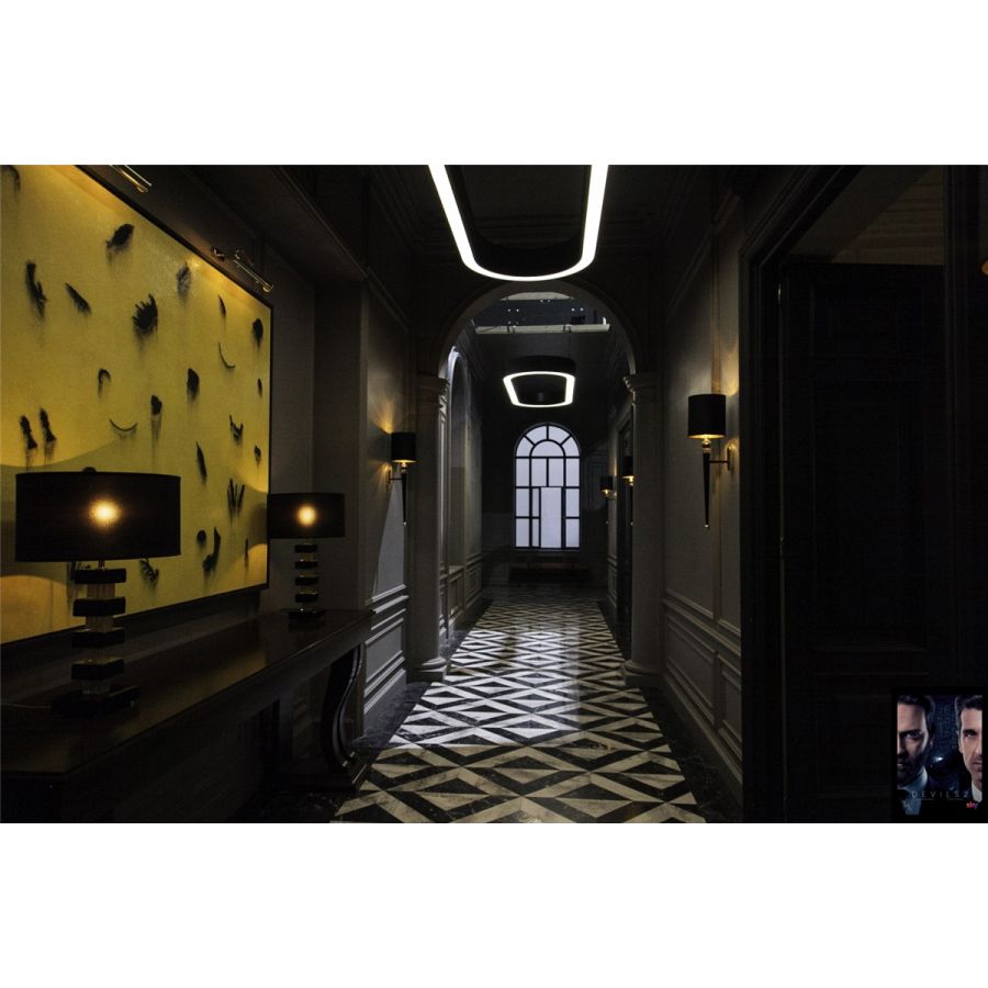 This elegant and refined wall lamp, ideal for perfect lighting of halls and corridors, comes with a refined cylindrical lampshade in black fabric with gold interior.
