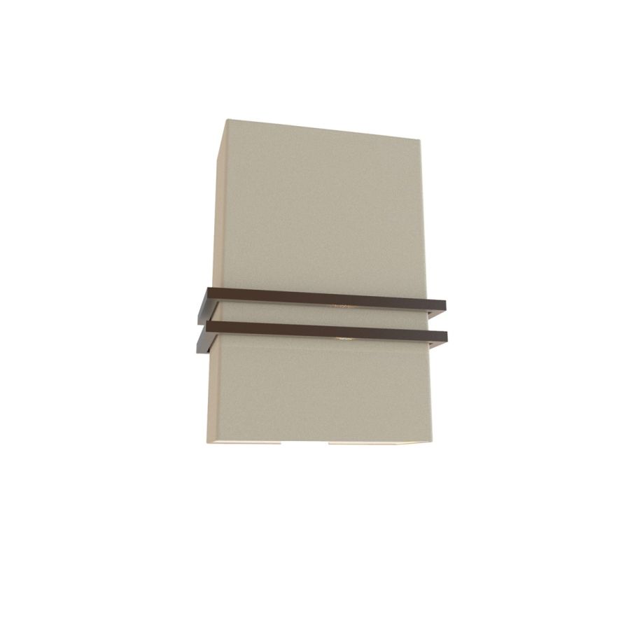 Wall lamp with a contemporary and refined design excellent for bedrooms, corridors and common areas, composed of a central structure with two parallel rods in bronzed brass that surrounds a rectangular lampshade in ivory fabric.