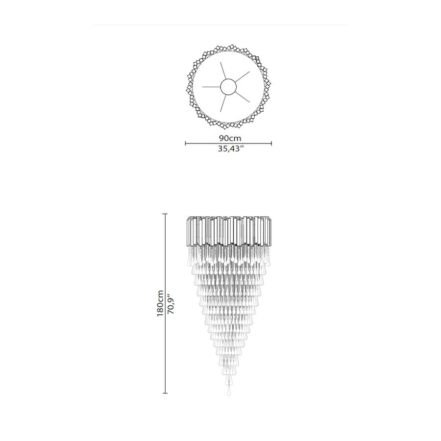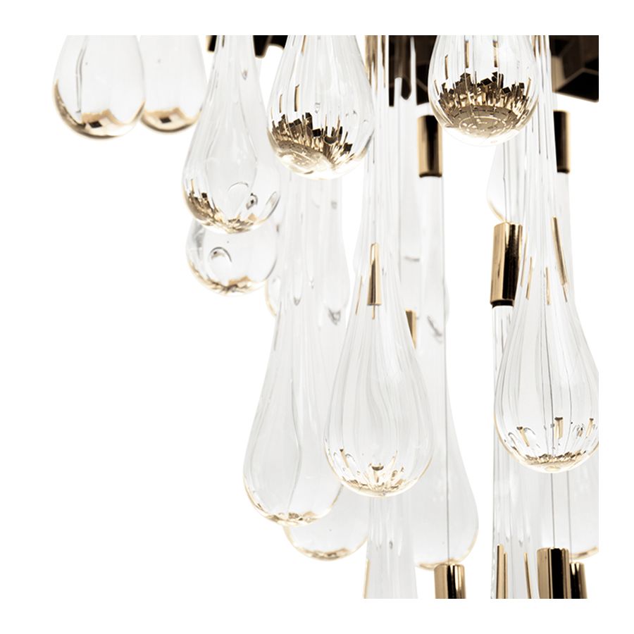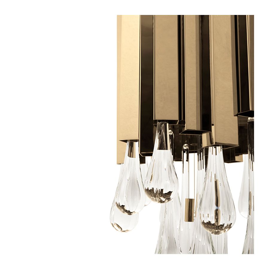 This large gold crystal chandelier was sculpted to convey a similar aesthetic of its lineage. On top, connected gold-plated brass structures serve as the main base for an opulent crystal glass masterpiece placed underneath. Each one of these sublime glass tears were designed with high attention to detail and traditional craftsmanship techniques. The perfect luxury chandelier for a refined ambiance.