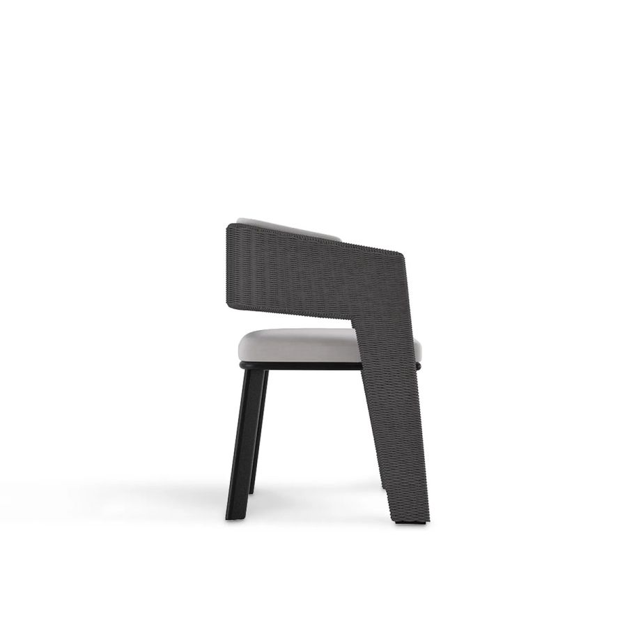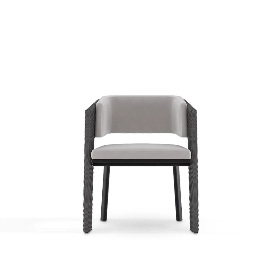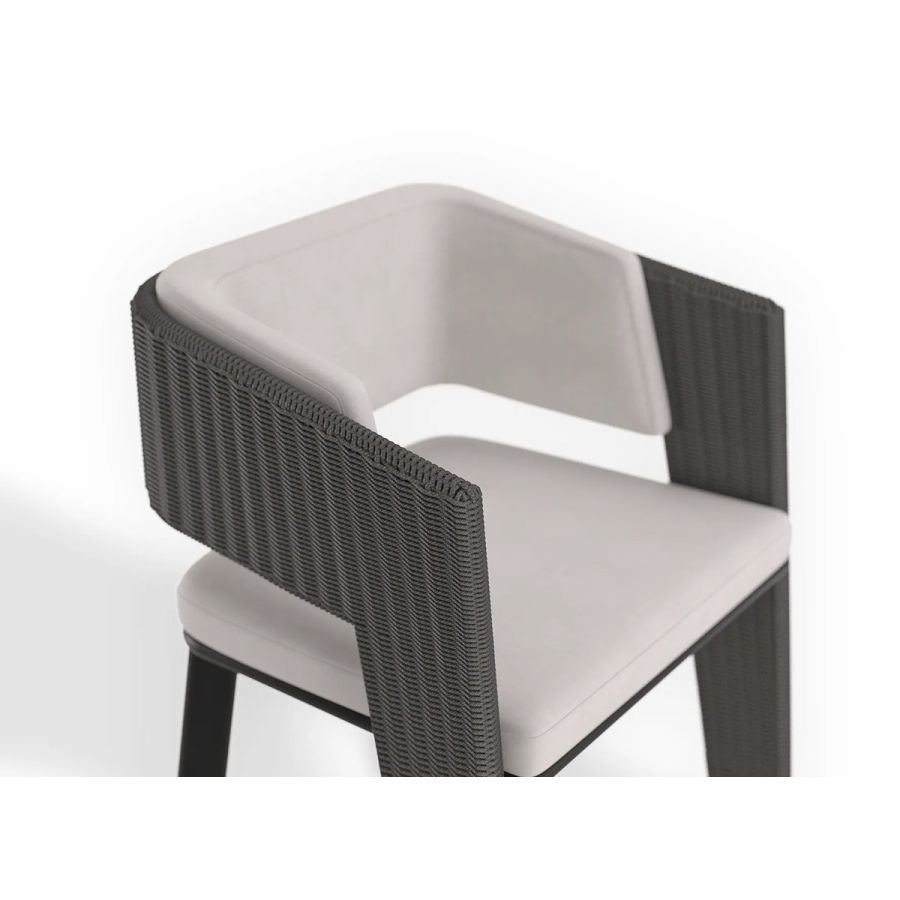 Galea is a glamorous outdoor dining chair that blends ancient with modern. It draws inspiration from an helmet worn by warriors in the Roman Empire and is brought to life through traditional weaving technics from Indonesia, combined with Portuguese exquisite Metal work for a durable and resistant outdoor piece. Made with Stainless Steel, Powder Coating & Synthetic Fiber this elegant chair with an Anthracite Rope Color is perfect for a relaxed yet luxurious outdoor.