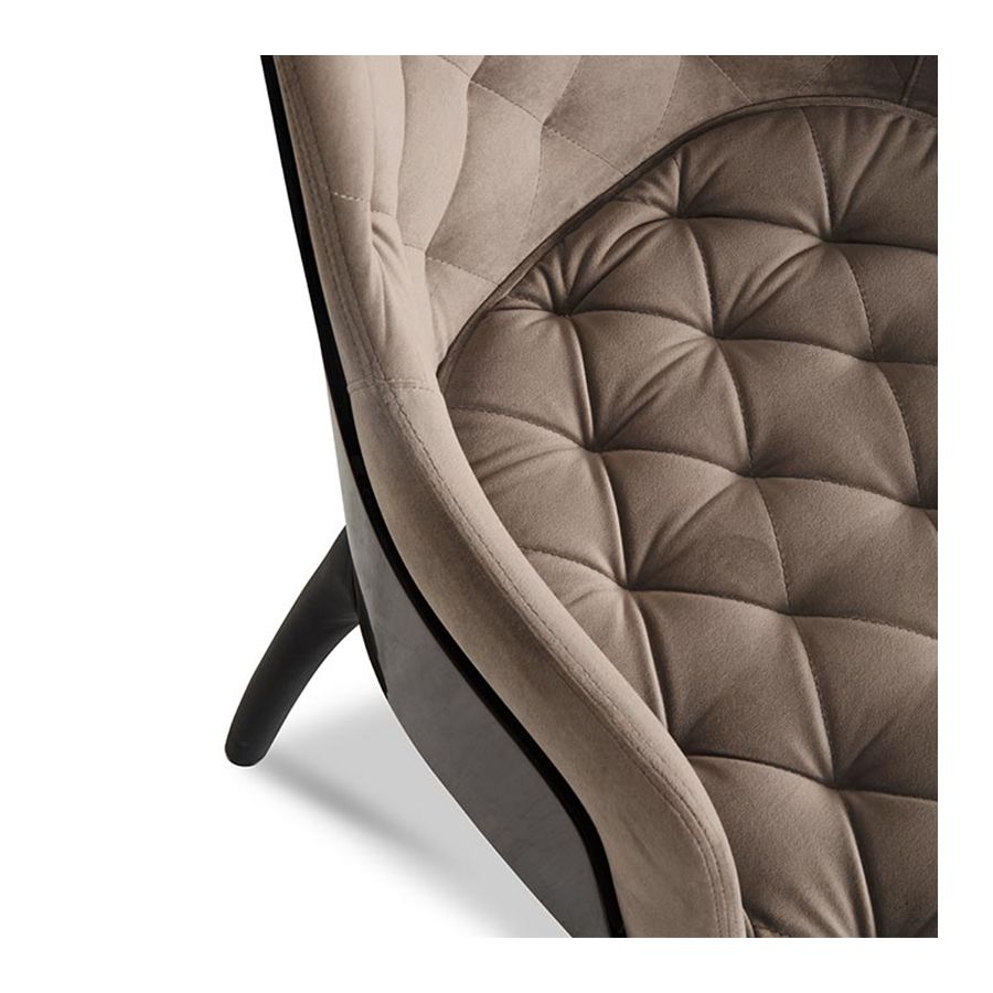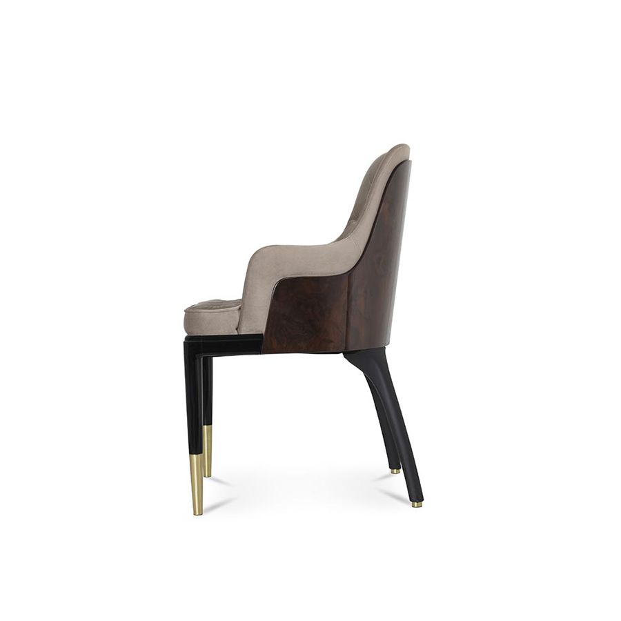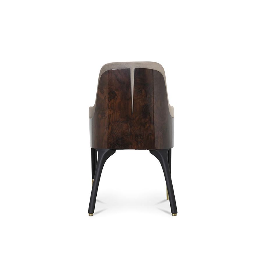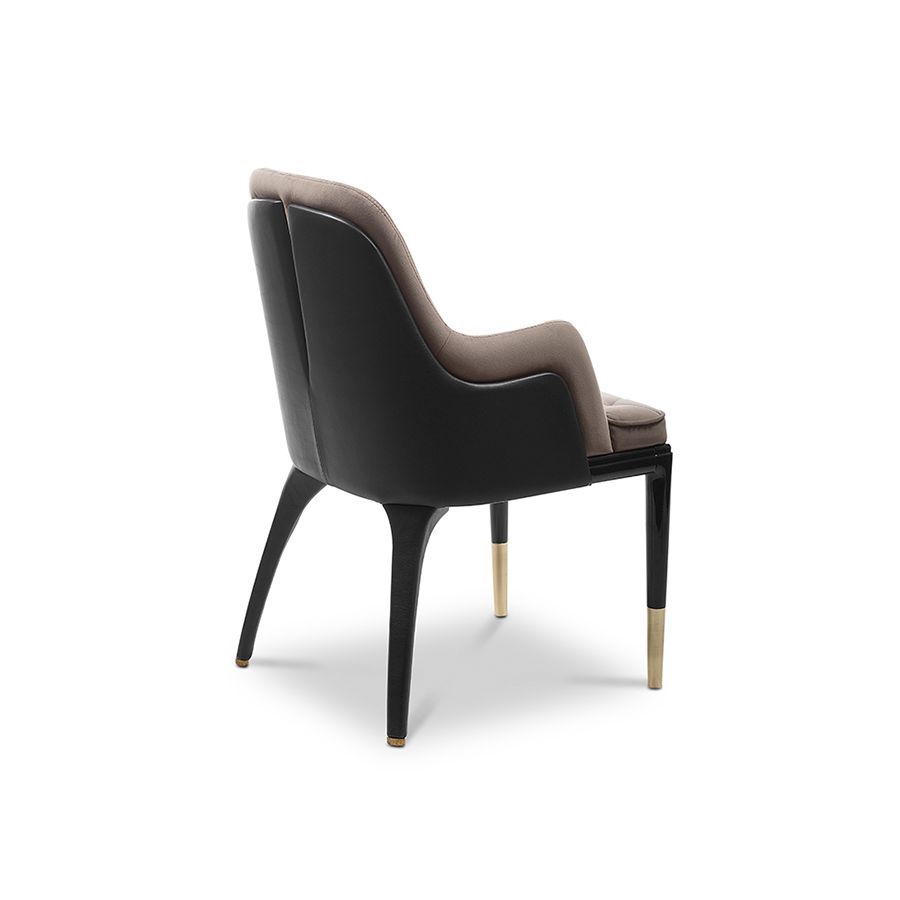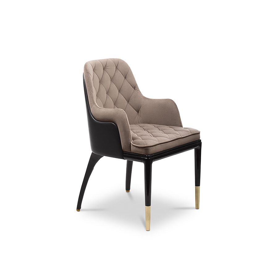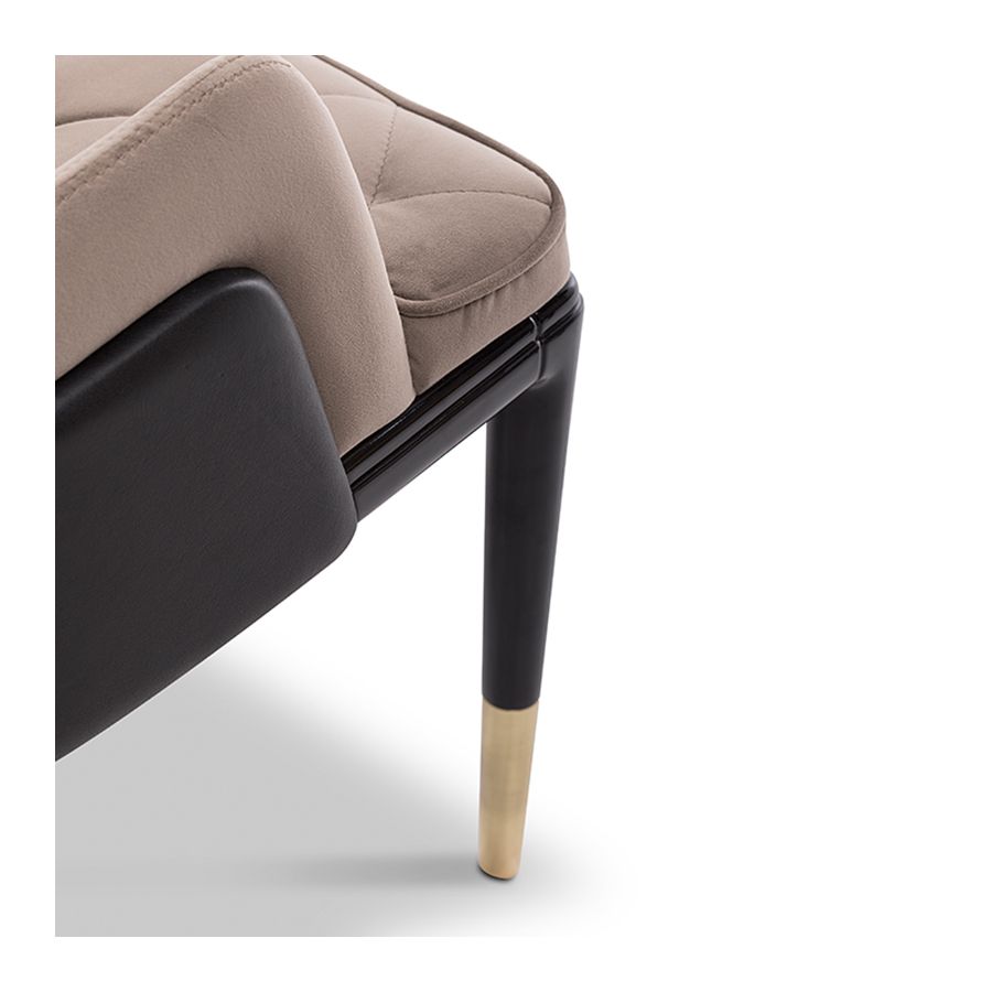 Charla dining chair is a splendid object of boundless elegance. This marvelous design is the perfect example of timeless lines with a modern twist, by using a complexity of luxurious materials, such as velvet, brass and lacquered wood.